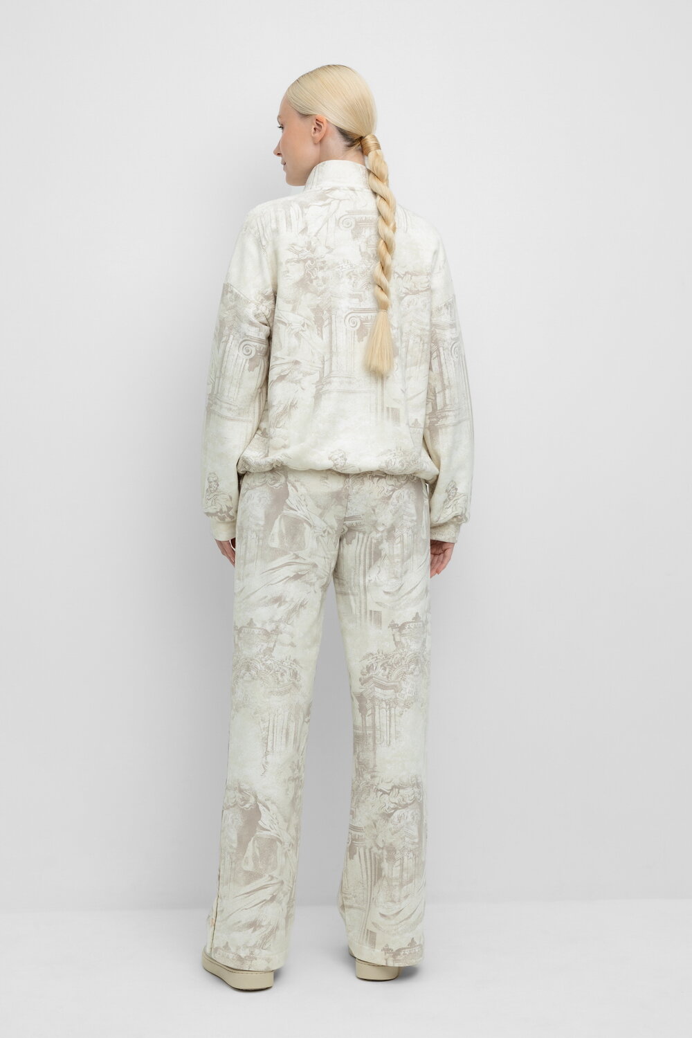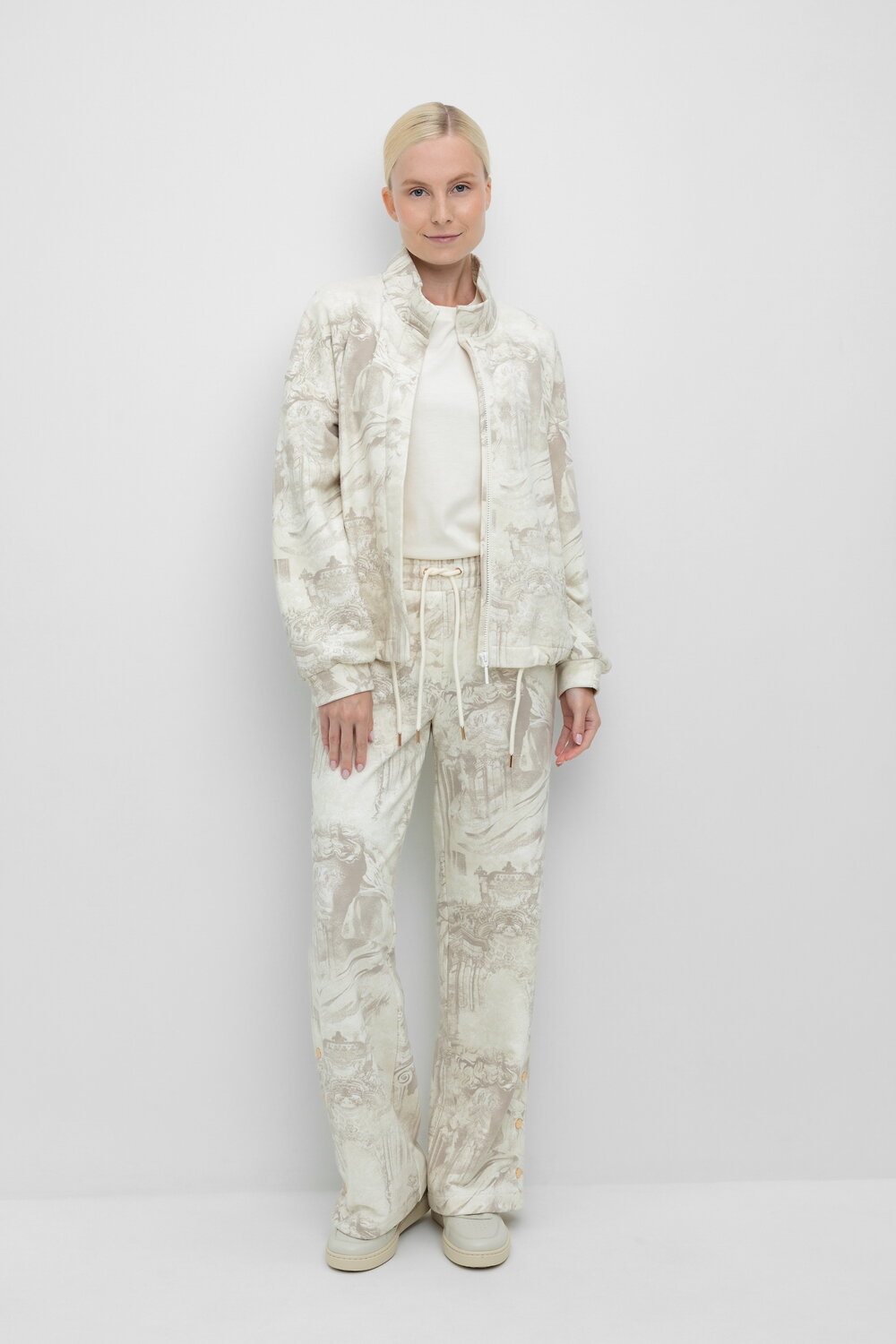 Укороченная трикотажная куртка на молнии с карманами и кулиской по низу. Произведена из мягкого набивного трикотажного футера. Спущенные рукава и манжеты добавляют объем.
