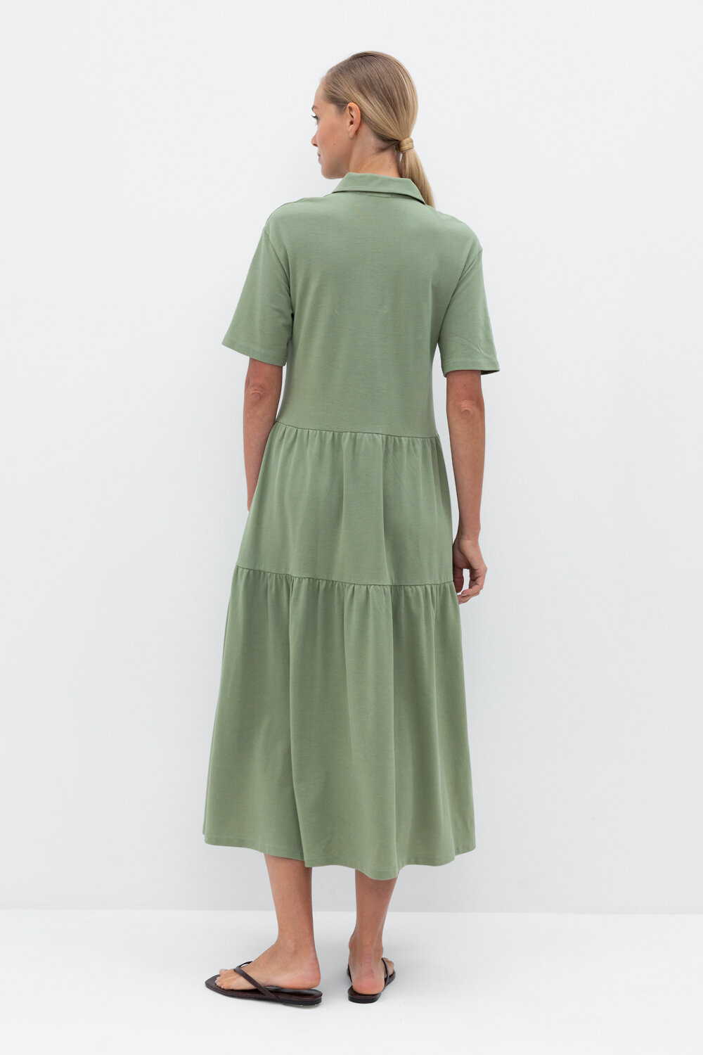 Женское платье из однотонного пике с воротником поло, короткими рукавами и широкими оборками . Все трикотажные полотна производятся в соответствии с нормами Швейцарского сертификата ЭкоТекс. Сделано в России