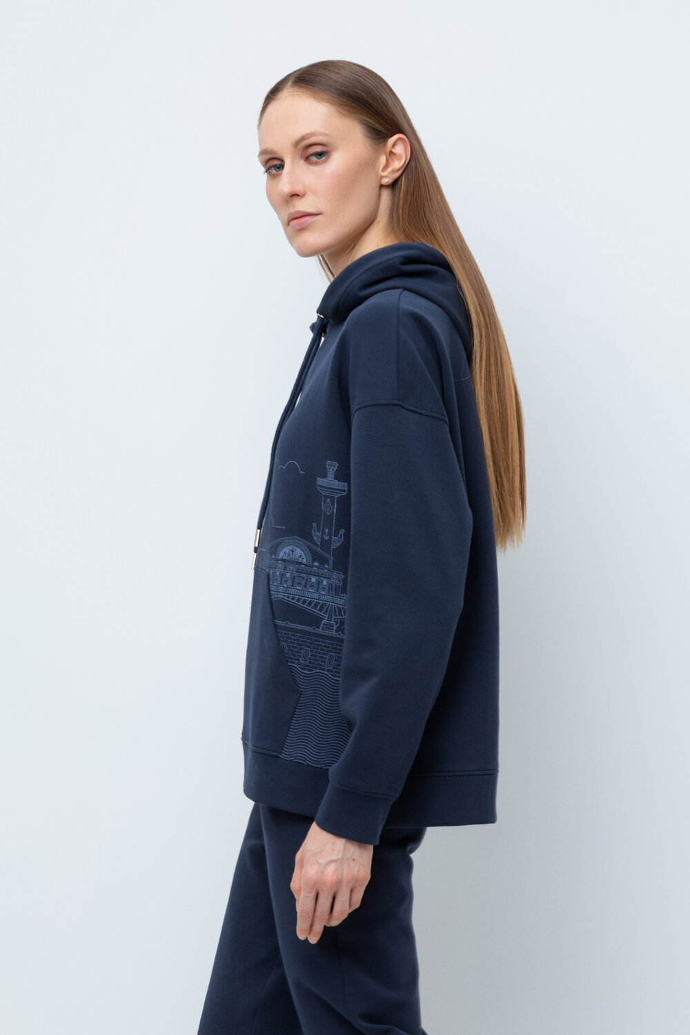 Женская толстовка-оверсайз из плотного гладкого трикотажа интерлок со спандексом. Капюшон регулируется с помощью шнура. У изделия свободная посадка, карман-кенгуру, манжеты. По бокам разрезы. Гладкий и плотный материал на основе хлопка сохраняет форму.