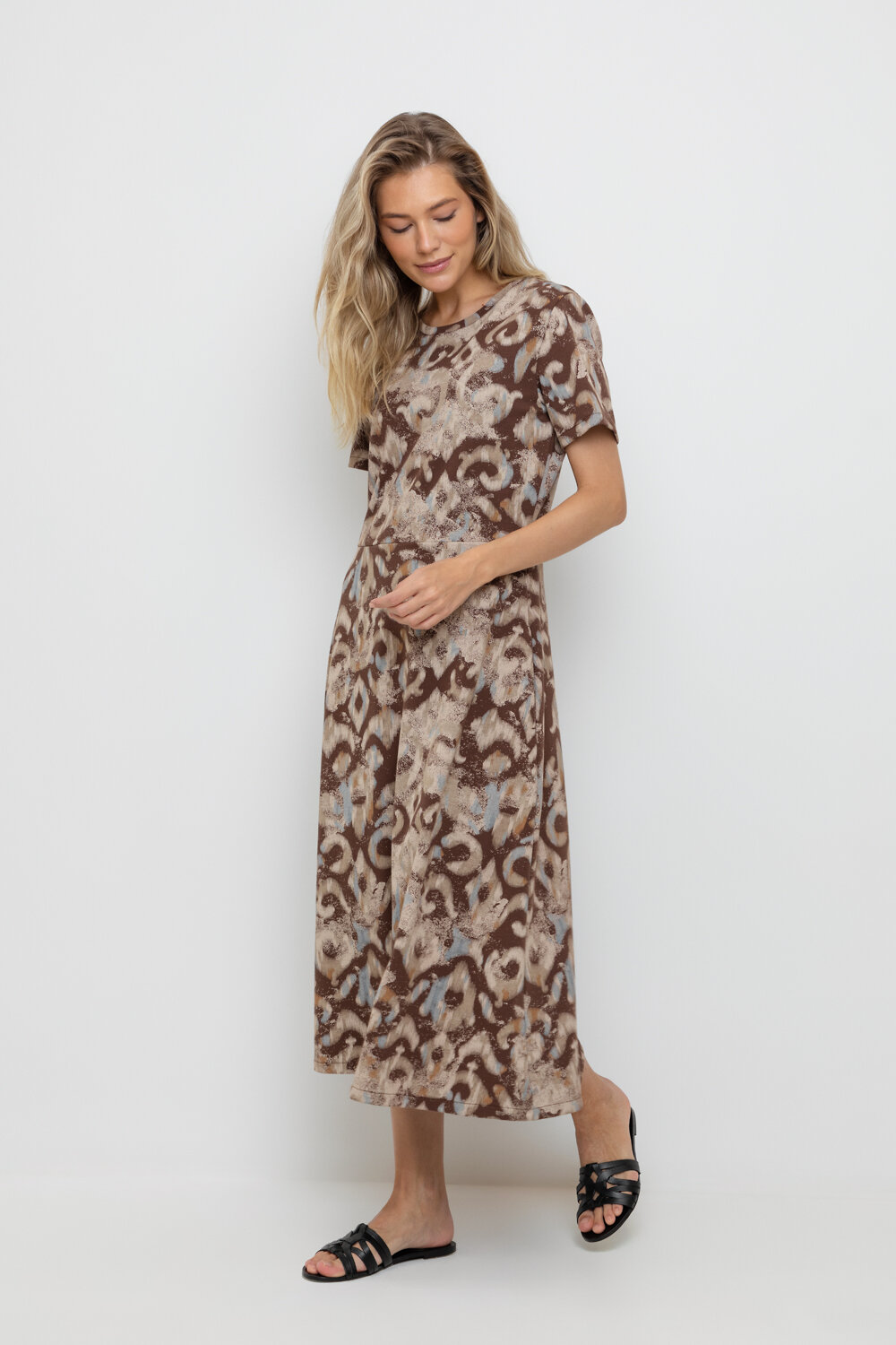 Платье с круглым вырезом и короткими рукавами из плотного набивного трикотажа интерлок. Модель с трапециевидной юбкой и боковыми карманами.