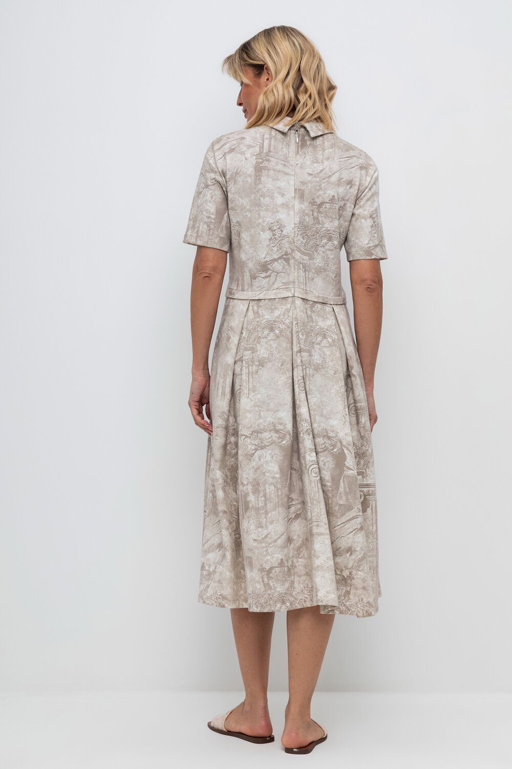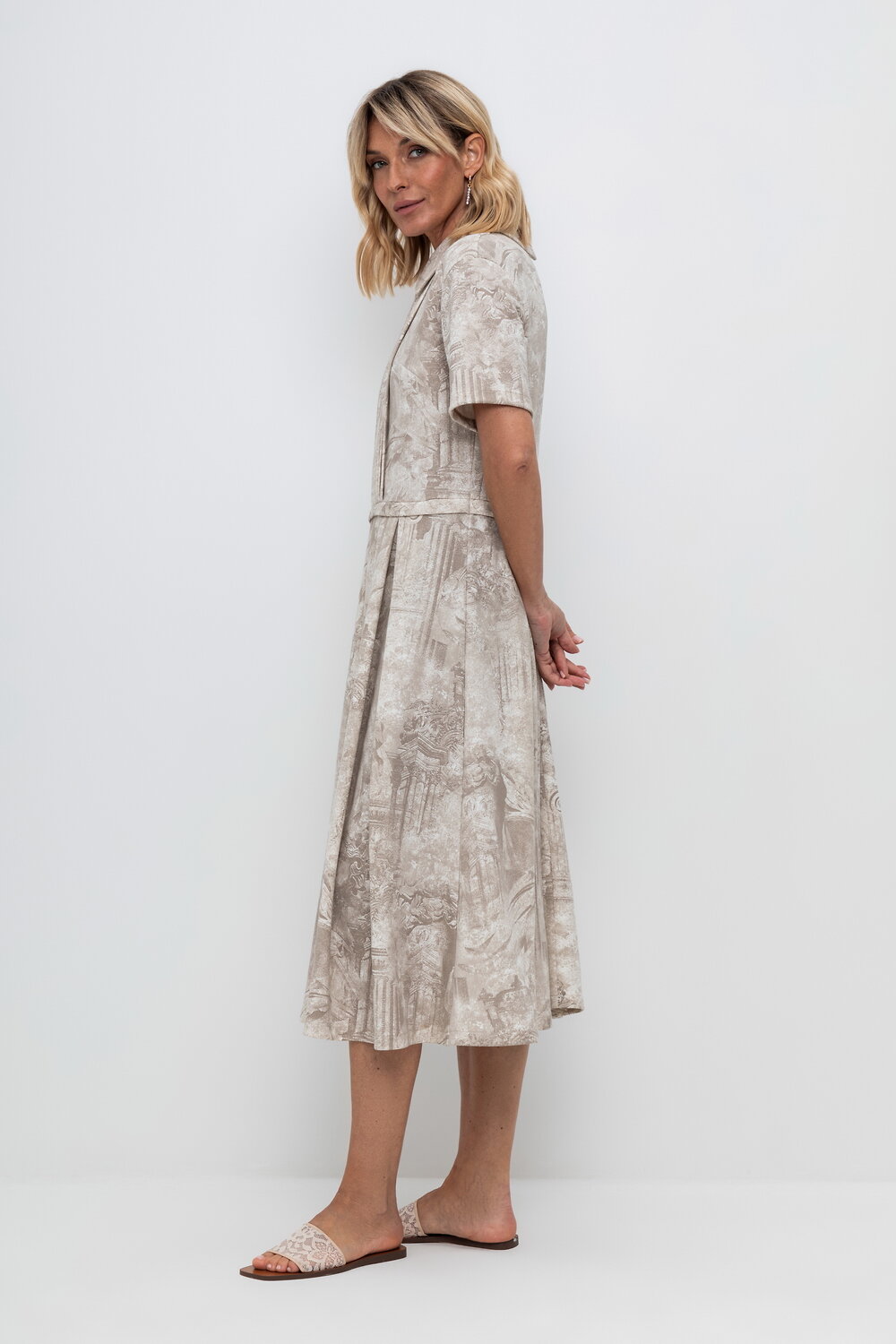 Платье с воротником из плотного набивного трикотажа интерлок. Модель с короткими рукавами, юбкой в складку и декоративными застроченными складками по груди.