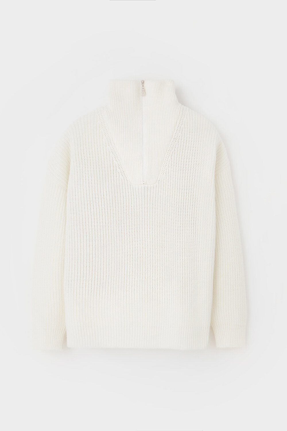 Уютный джемпер в стиле оверсайз со спущенным плечом и объемными рукавами из полушерстяной пряжи. Воротник-стойка застёгивается на молнию.