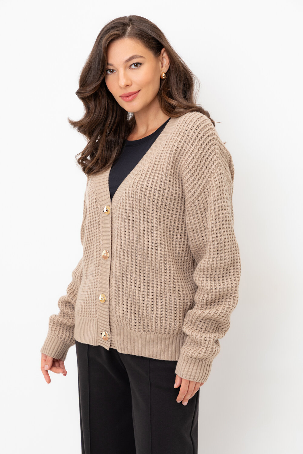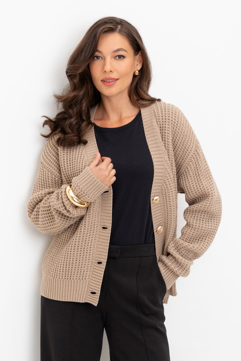 Вязаный кардиган на пуговицах из шерсти с добавлением акрила. Ажурная вязка, манжеты и нижний край не растянутся благодаря вывязанной резинке.
