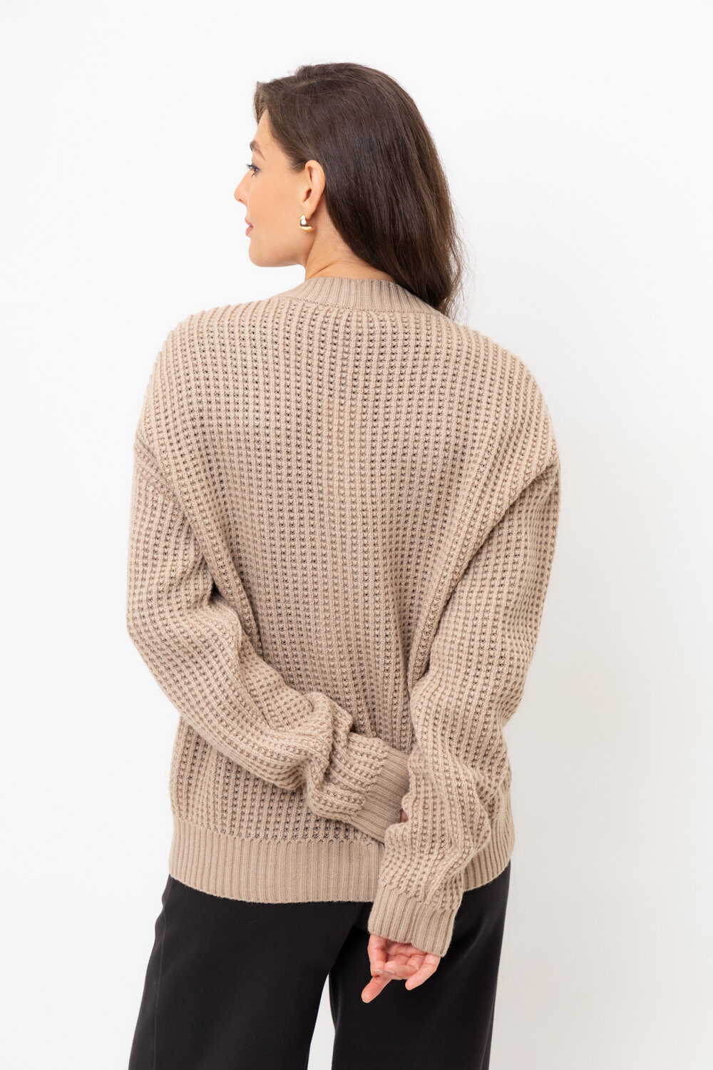 Выполнен из мягкой полушерстяной пряжи. Шерсть мериноса в составе сохраняет тепло, акрил делает изделие мягким. Прямой силуэт идеально подходит как к юбке, так и к брюкам.