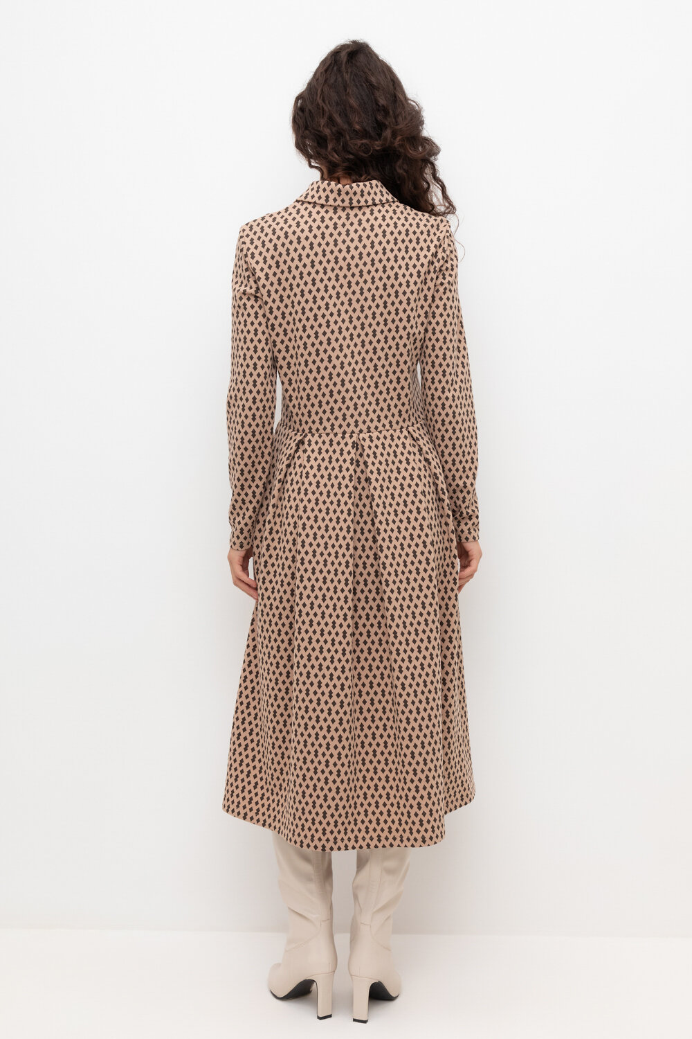 Платье с воротником из плотного набивного трикотажа интерлок. Модель с длинными рукавами и юбкой в складку. Все трикотажные полотна производятся в соответствии с нормами Швейцарского сертификата ЭкоТекс. Сделано в России
