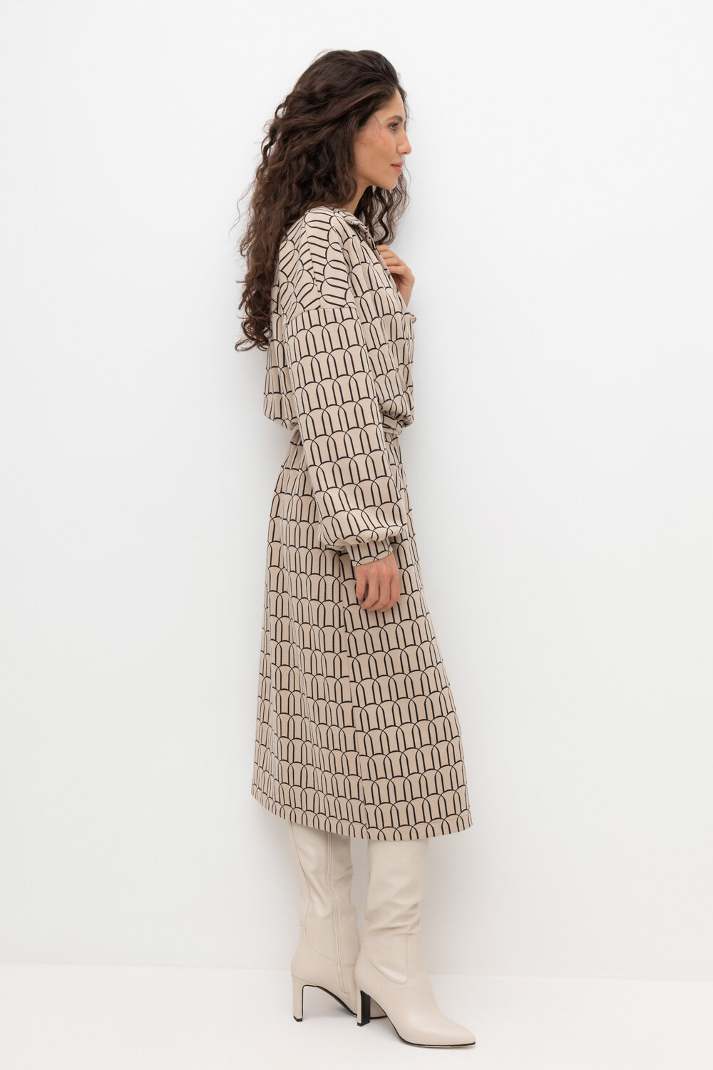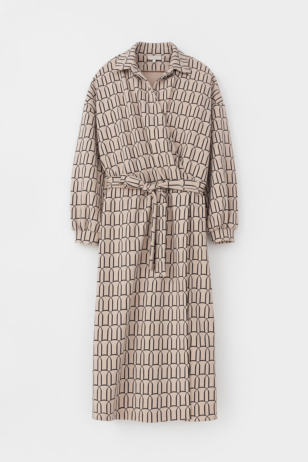 Платье на запах с воротником из плотного набивного трикотажа интерлок. Модель с длинными объемными рукавами. С помощью пояса можно регулировать посадку и силуэт.