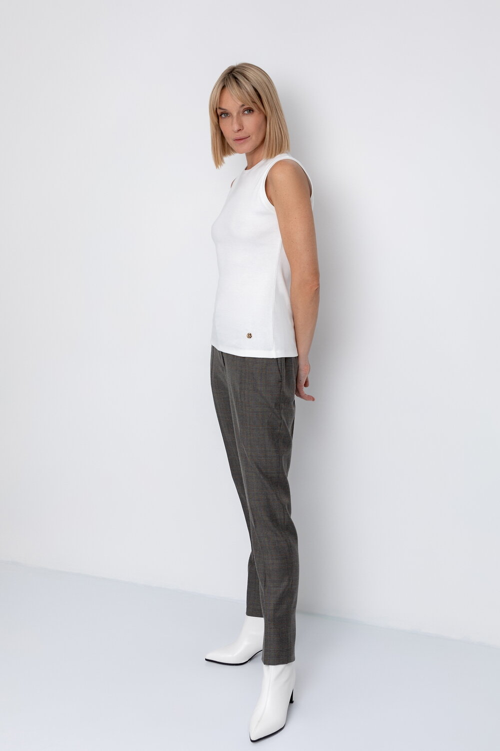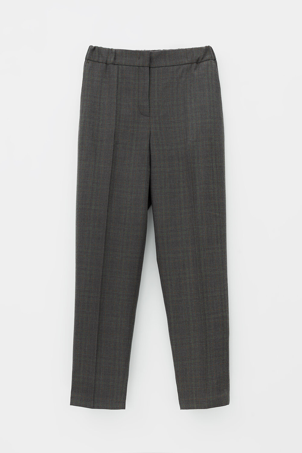 Брюки из костюмной ткани с добавлением шерсти в клетку прямого силуэта, слегка зауженные книзу с боковыми карманами и заутюженными стрелками. Комфортый пояс на резинке. Застегивается спереди на молнию и брючный крючок.