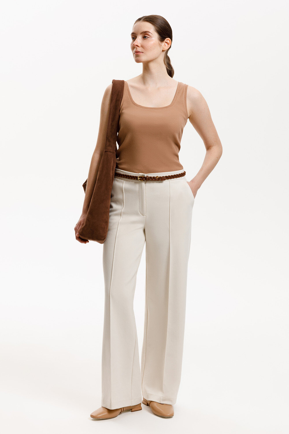 Классическим элементом гардероба является базовый топ в рубчик. Узкие бретели и глубокий вырез делают изделие комфортным в носке и универсальным в повседневной жизни.