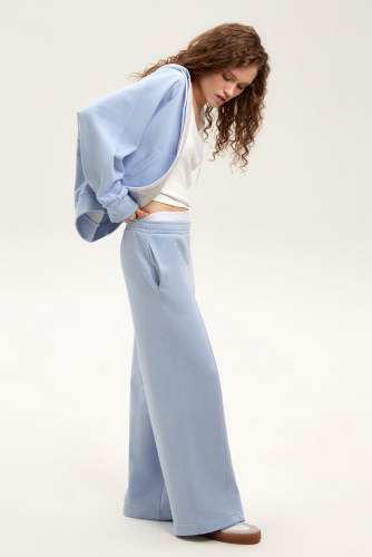 Объемный свитшот из двухцветного трикотажного футера. Внутренняя сторона изделия представлена в натуральном цвете хлопка, внешняя в нежно-голубом. За счет использования крашенной пряжи, данный вид полотна прошел минимальную обработку, что придало изделию мягкость и шелковистость.