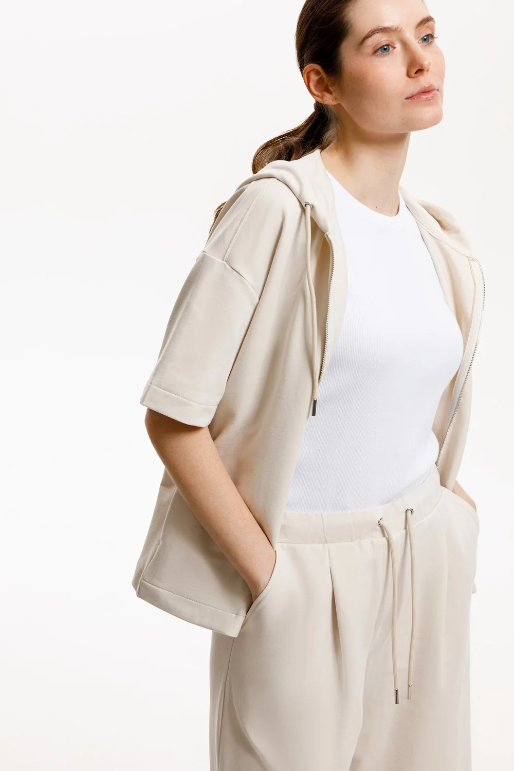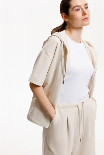 Толстовка из мягкого эластичного футера с коротким рукавом сочетает в себе спортивный и базовый стиль. Изделие дополнено капюшоном и блеском металлической фурнитуры. В сочетании с брюками из этой коллекции вы создадите образ для приятных летних прогулок.