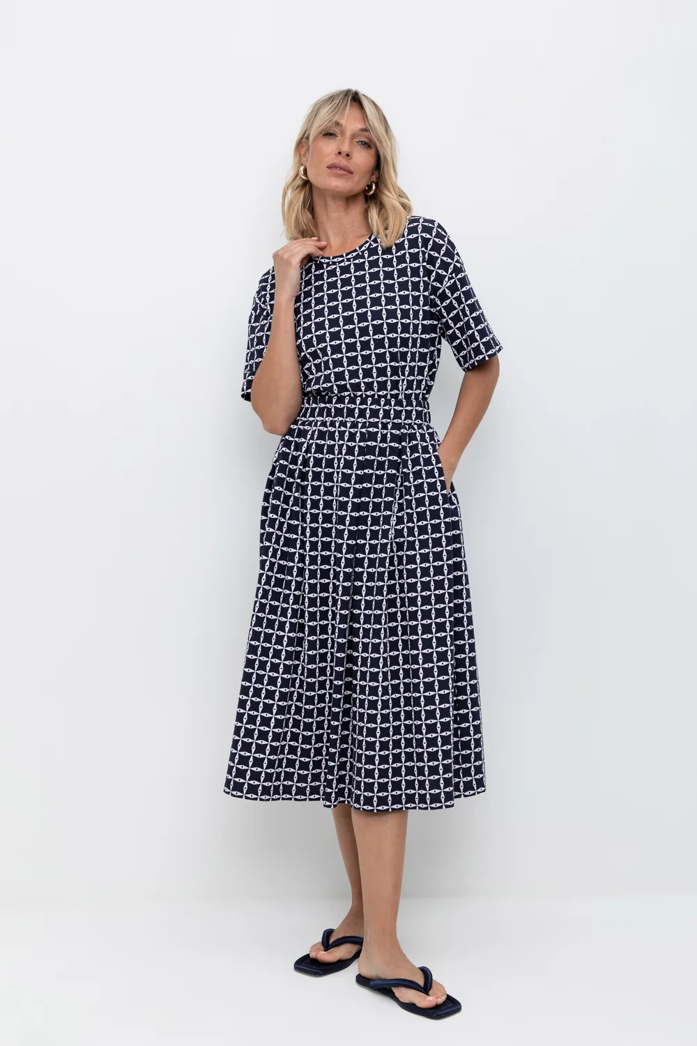 Юбка миди из набивного пике с широкими мягкими складками и боковыми карманами.