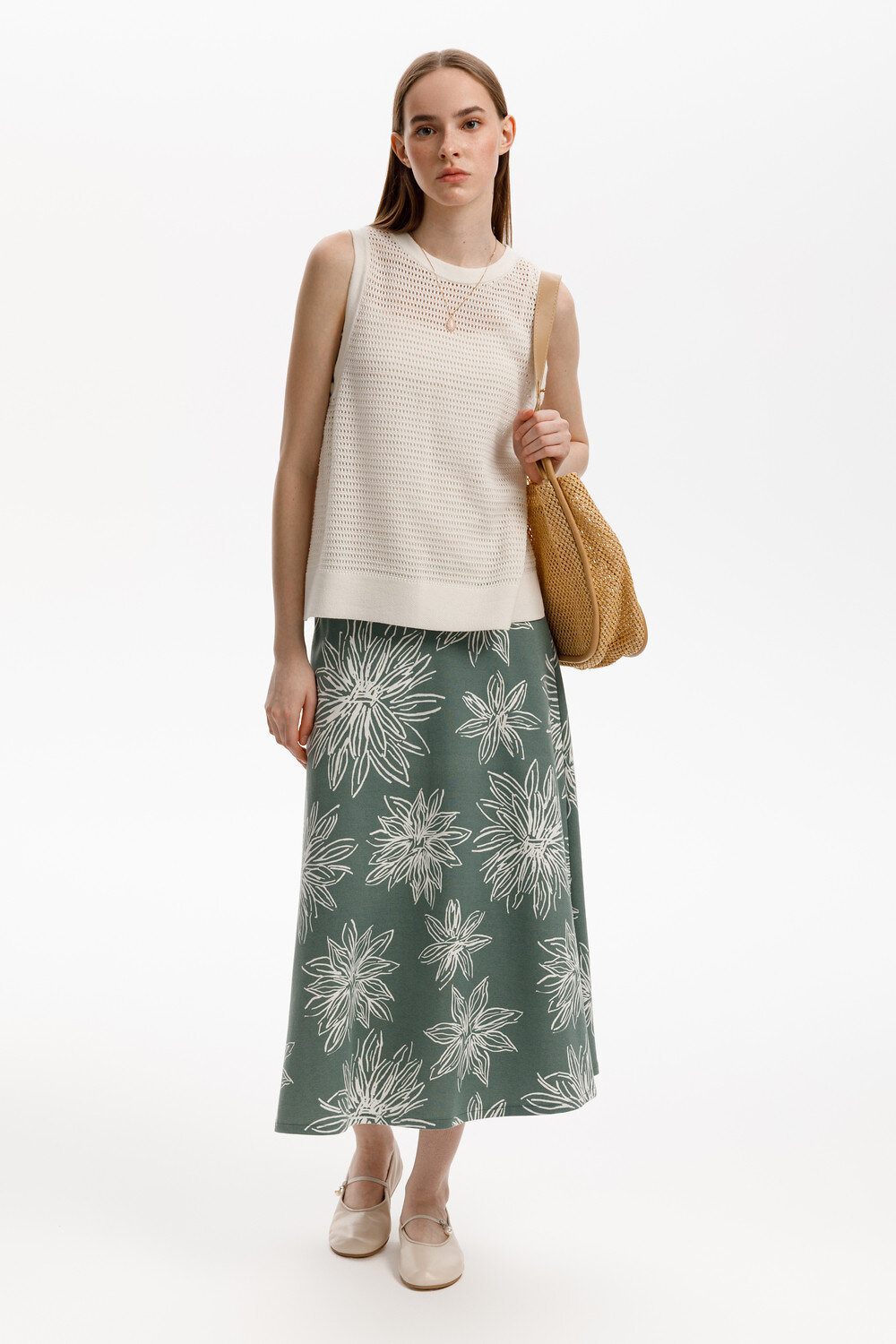 Удлиненная юбка расклешенного силуэта, изготовленная из премиального трикотажного полотна DOUBLE FACE. Мягкий на ощупь трикотаж выполнен из высококачественной гребенной пряжи, а его дизайн добавляет летнего настроения. Подберите летний образ, добавив блузу из этой коллекции.