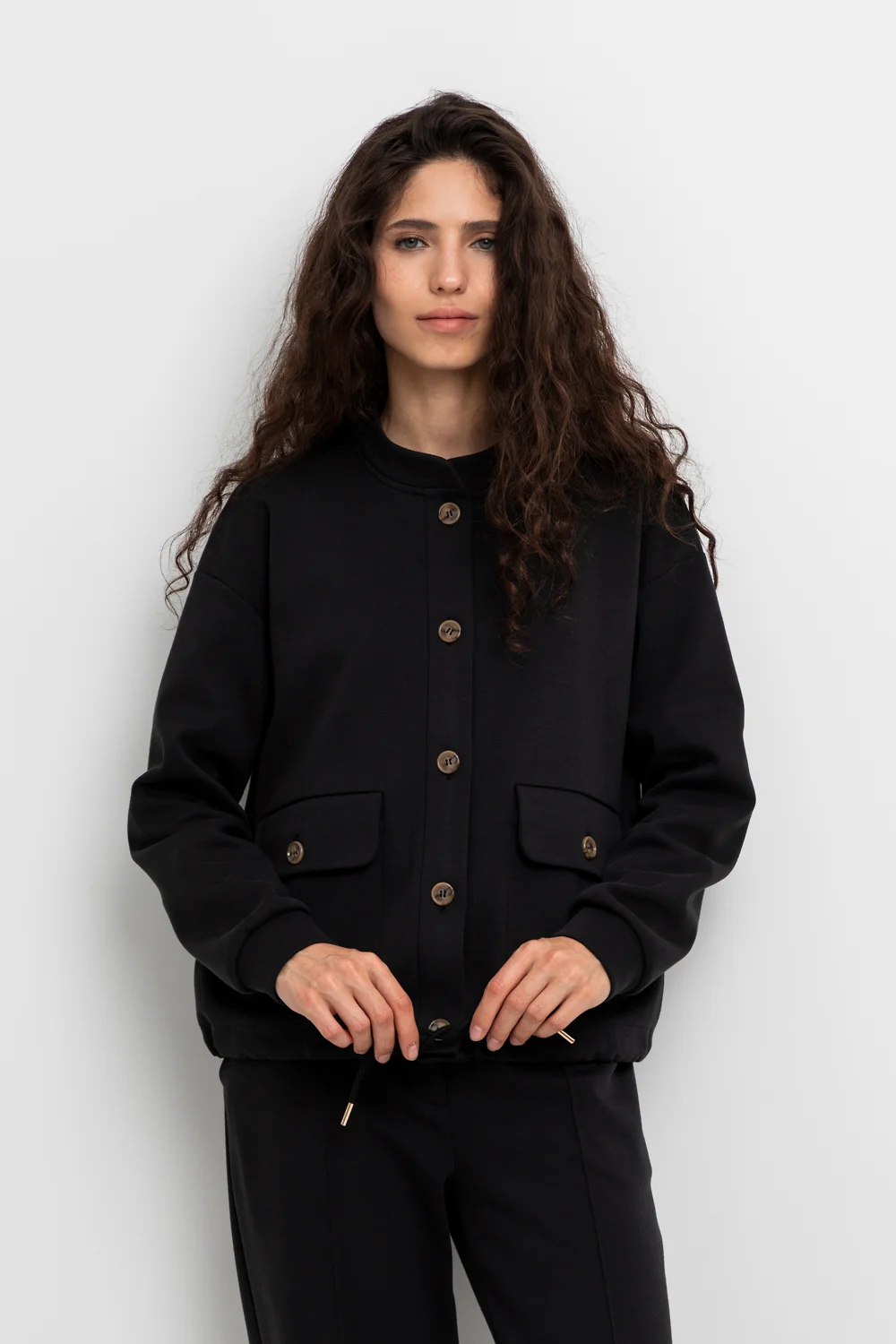 Укороченная куртка на пуговицах с карманами и кулиской по низу из плотного гладкого трикотажа интерлок. Спущенные рукава и манжеты добавляют объем.