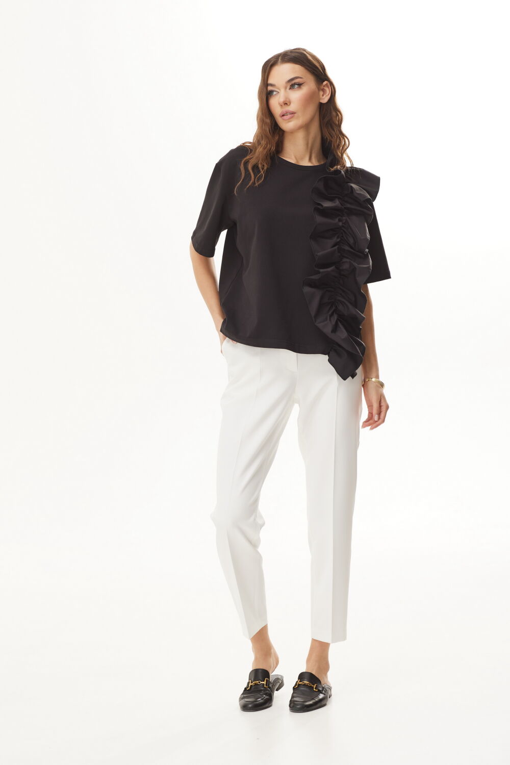 Брюки, зауженные к низу из костюмной ткани. Верх на поясе со шлевками. Застежка на молнию спереди и пуговицу на поясе. В боковых швах карманы.