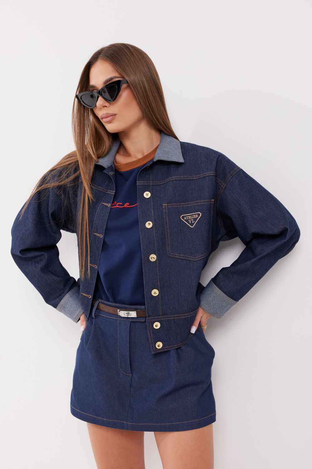 Жакет свободного силуэта из джинсовой ткани. Застёжка по переду на петли и пуговицы. Воротник рубашечный. По переду накладные карманы, на левом кармане вышивка. Кокетка по спинке и по переду. Расширенная линия плеча. Рукав прямой с манжетой. Манжета с застёжкой на петлю и пуговицу. По низу жакета притачной пояс.