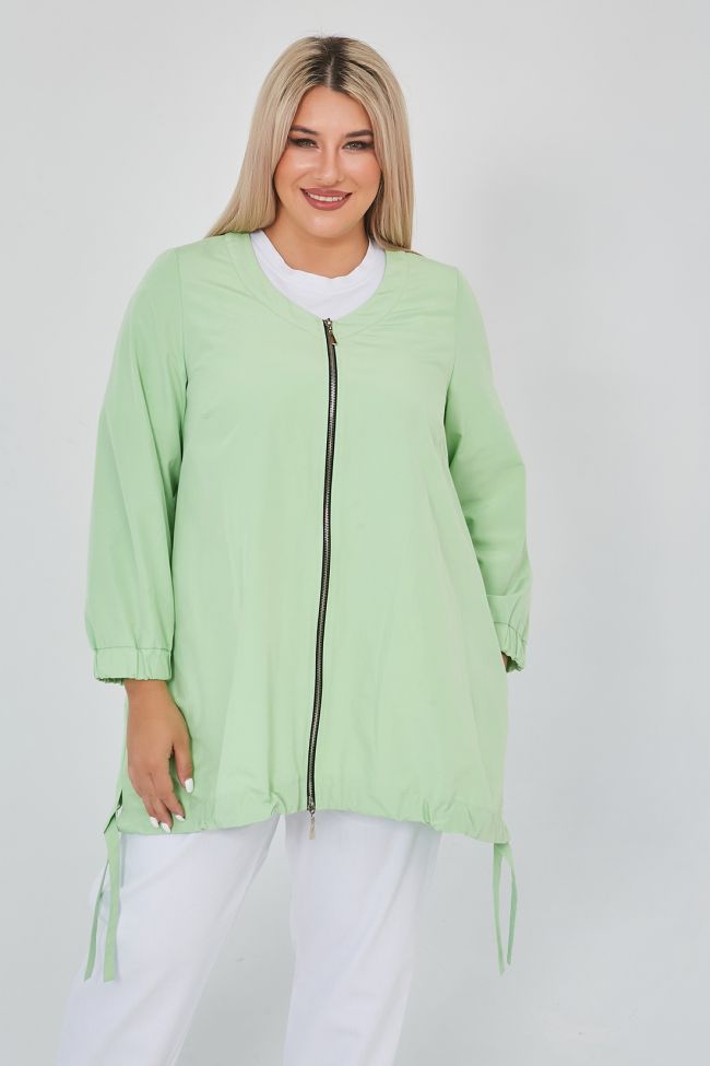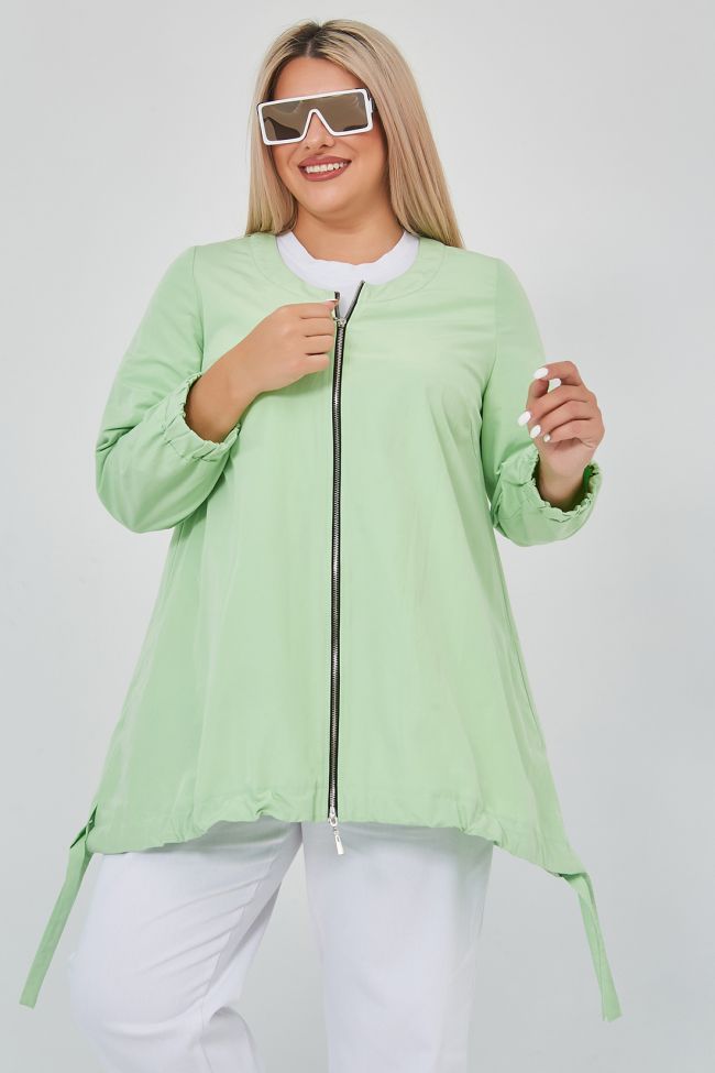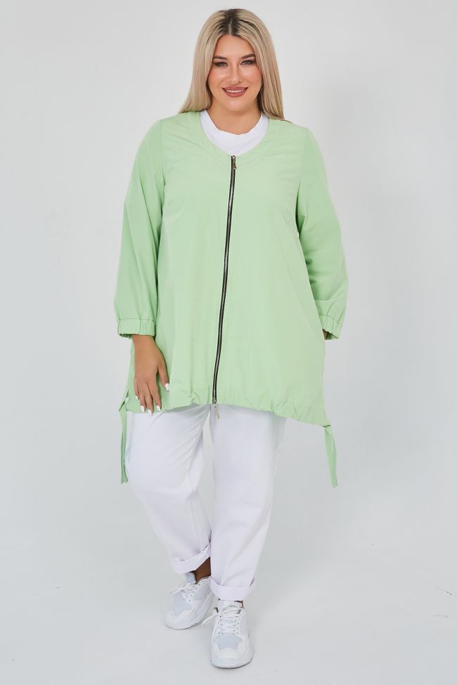 светло-зеленый Свободная ветровка трапециевидного силуэта из плащевой однотонной ткани.  V - образный вырез горловины оформлен широкой обтачкой. По переду - центральная застежка на тесьму - молнию. Длинные втачные рукава, дополнены широкой манжетой на резинке. Модель с асимметричным низом - подчеркнутым притачной кулиской, по бокам разрезы с завязками. В боковых швах удобные карманы.