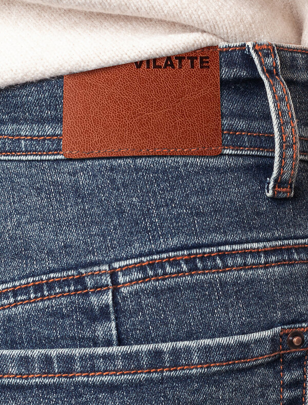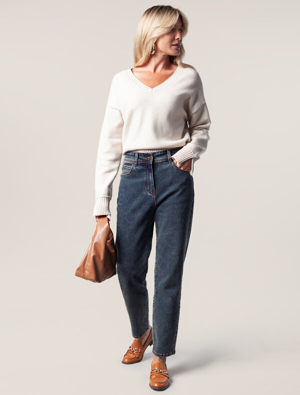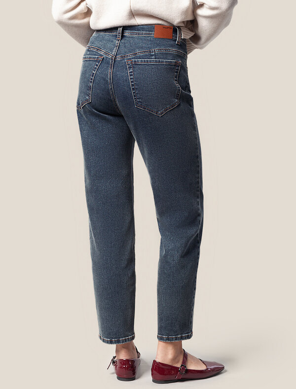 Джинсы mom-fit серо-голубого цвета с контрастными строчками выполнены из эластичного денима. Лаконичная модель с легкой стиркой хорошо впишется в непринужденный повседневный образ с вещами и нейтральной, и яркой гаммы. Комфортная посадка на талии подходит для любой фигуры, ткань хорошо тянется и не сковывает движений. Изделие дополнено классической задней нашивкой из бежевой эко-кожи с логотипом бренда.
