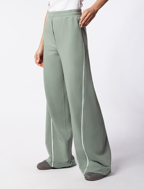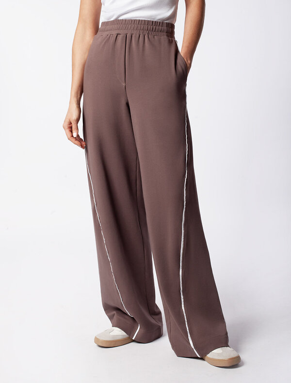 Брюки свободного кроя с контрастными лампасами выполнены из эластичного футера двухнитки. Модель дополнена боковыми карманами. Пояс на резинке фиксируется внутренним хлопковым шнуром. Диагональные визуально стройнят силуэт, а образ становится динамичным. Сочетайте изделие в костюме с паркой D49.076 и свитшотом D49.073