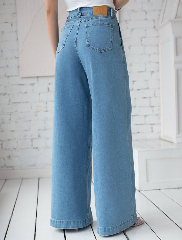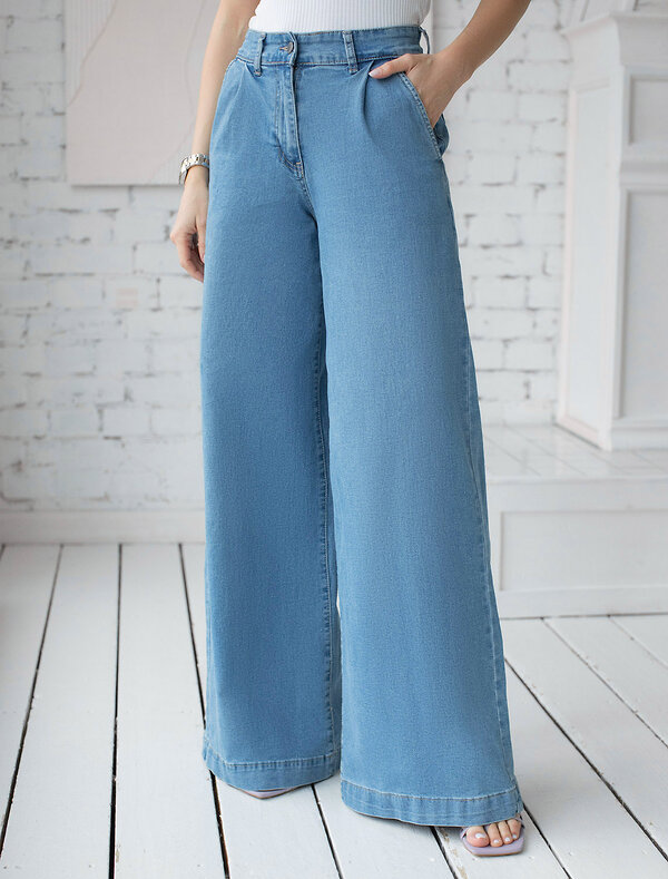 Джинсы свободного из тонкого денима с эластаном. Модель с защипами и карманами как у брюк при нестрогом дресс-коде может заменить классические брюки в офис. Посадка на талии и свободный крой визуально вытягивают ноги и подчеркивают фигуру. Эластичный хлопковый материал хорошо держит форму и не деформируется.