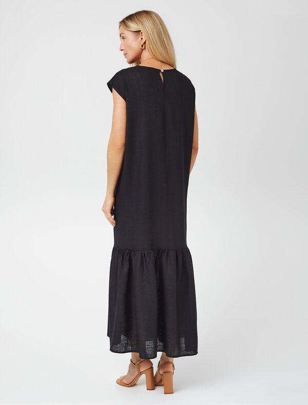 Платье длины миди прямого кроя с пышным воланом выполнено изо льна с вискозой. Сзади застежка на пуговицу из натурального перламутра. Лён в составе обеспечивает прочность и воздухопроницаемость, вискоза эластичность и гладкость ткани. Благодаря такому сочетанию изделие хорошо драпируется, меньше мнется и сохраняет форму в течении долгого времени. Свободный крой подходит для любой фигуры.