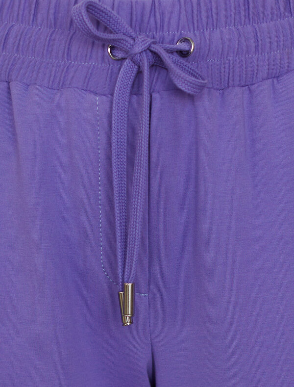 Брюки выполнены из футера двухнитки с эластаном. Модель прямого кроя дополнена боковыми карманами и одним задним карманом. Пояс выполнен из эластичного трикотажа в рубчик. В пояс вставлен плоский хлопковый шнур в тон изделия с серебристыми наконечниками. Изделие дополнено металлическим логотипом бренда. Сочетается в костюме с жакетом D49.078, джемпером D49.079, D49.080 и футболкой D49.081