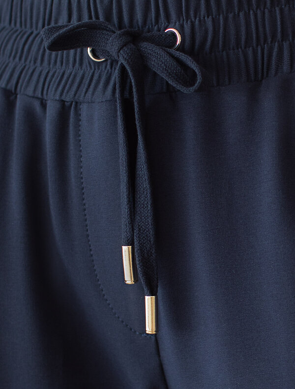 Брюки выполнены из футера двухнитки с эластаном. Модель прямого кроя дополнена боковыми карманами и одним задним карманом. Пояс выполнен из эластичного трикотажа в рубчик. В пояс вставлен плоский хлопковый шнур в тон изделия с золотистыми наконечниками. Изделие дополнено металлическим логотипом бренда. Сочетается в костюме с жакетом D49.078, джемпером D49.079, D49.080 и футболкой D49.081