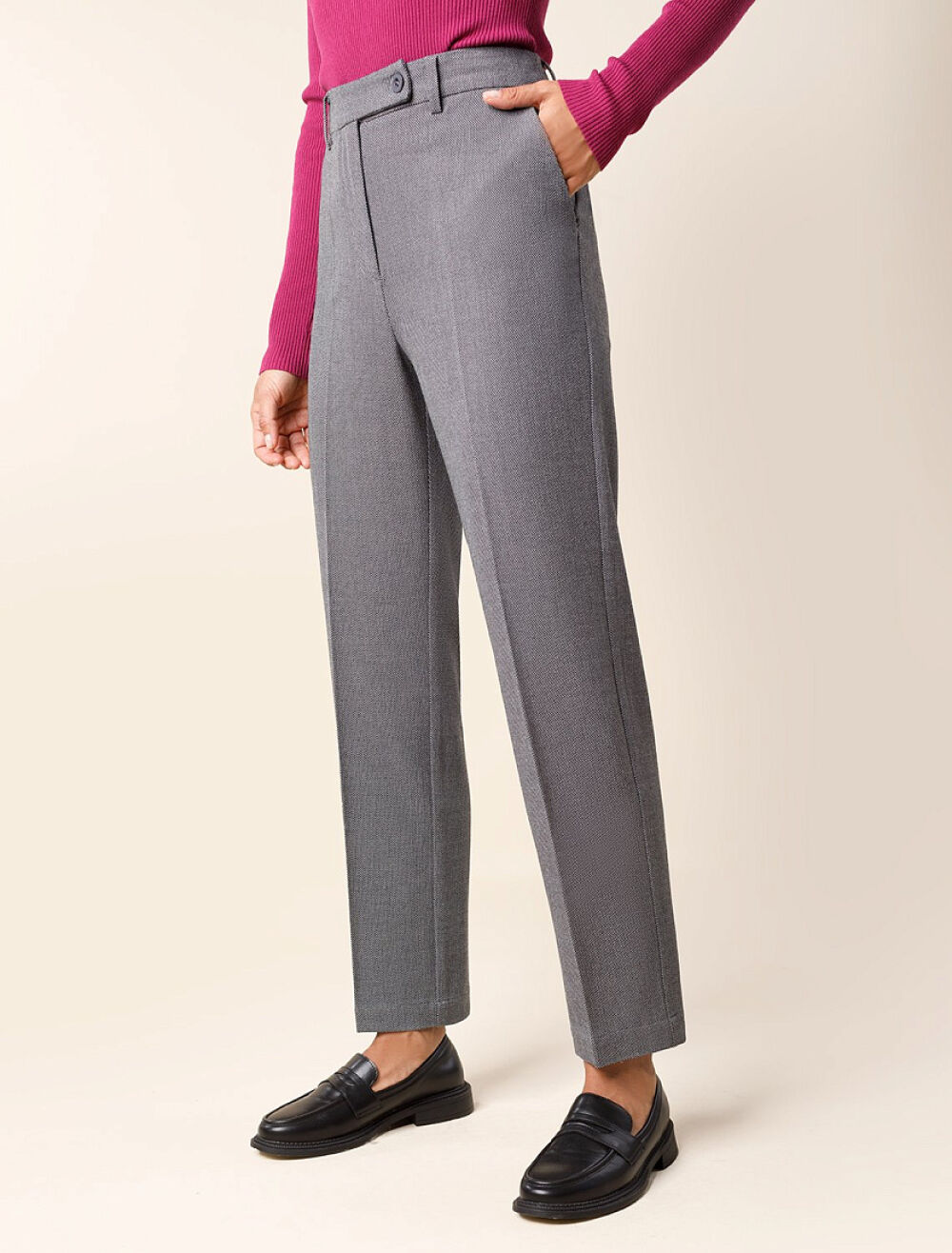 Укороченные брюки выполнены из фактурной черной поливискозы. Модель дополнена боковыми карманами и отлично подойдет как для строгого делового образа с блузкой и жакетом, так и для более расслабленного с футболкой и водолазкой. Эластичный материал изделия поддерживает оптимальный микроклимат, формоустойчивость и комфорт в течение всего дня.