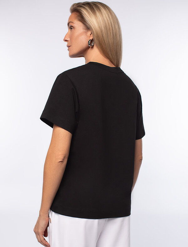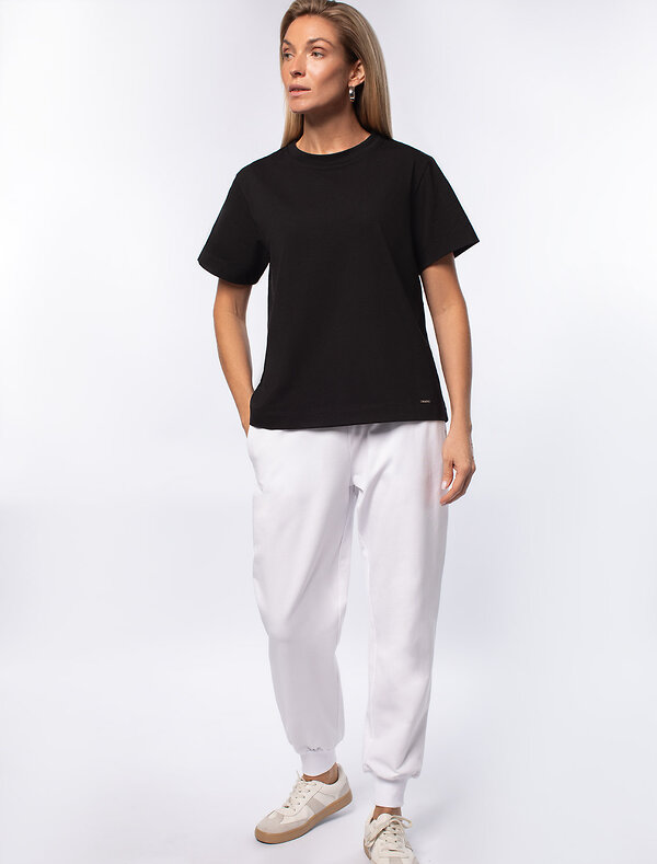 Футболка выполнена из премиального хлопка. Наличие эластана в составе гарантирует абсолютный комфорт и долговечность изделия. Базовая модель впишется в любой гардероб. Дополнительным украшением служит металлическим логотипом бренда.