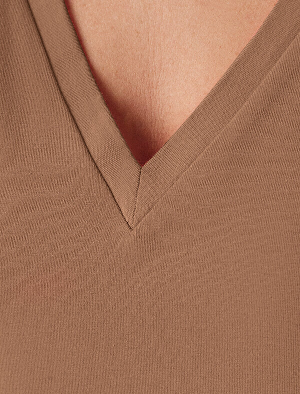 Футболка выполнена из премиального хлопка. Базовая модель с V-вырезом впишется в любой гардероб в любом сезоне. Наличие эластана в составе изделия гарантирует комфорт и формоустойчивость. На рукаве металлический логотип бренда.