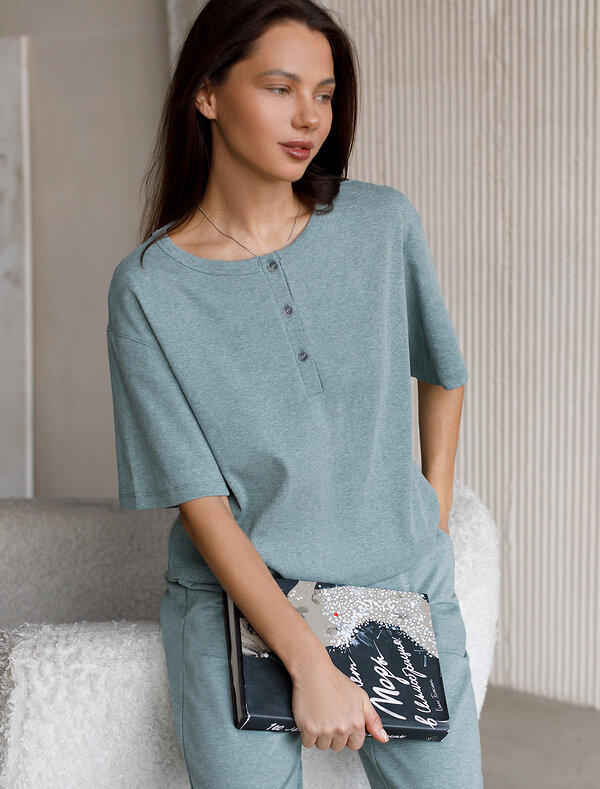 Футболка выполнена из фактурного трикотажа в рубчик. Модель свободного кроя дополнена пуговицами с логотипом бренда. Благодаря мягкой хлопковой ткани в рубчик, футболка очень приятная к телу. Эластан в составе гарантирует комфорт и формоустойчивость изделия. Сочетается в костюме с шортами D48.007 и брюками D44.121