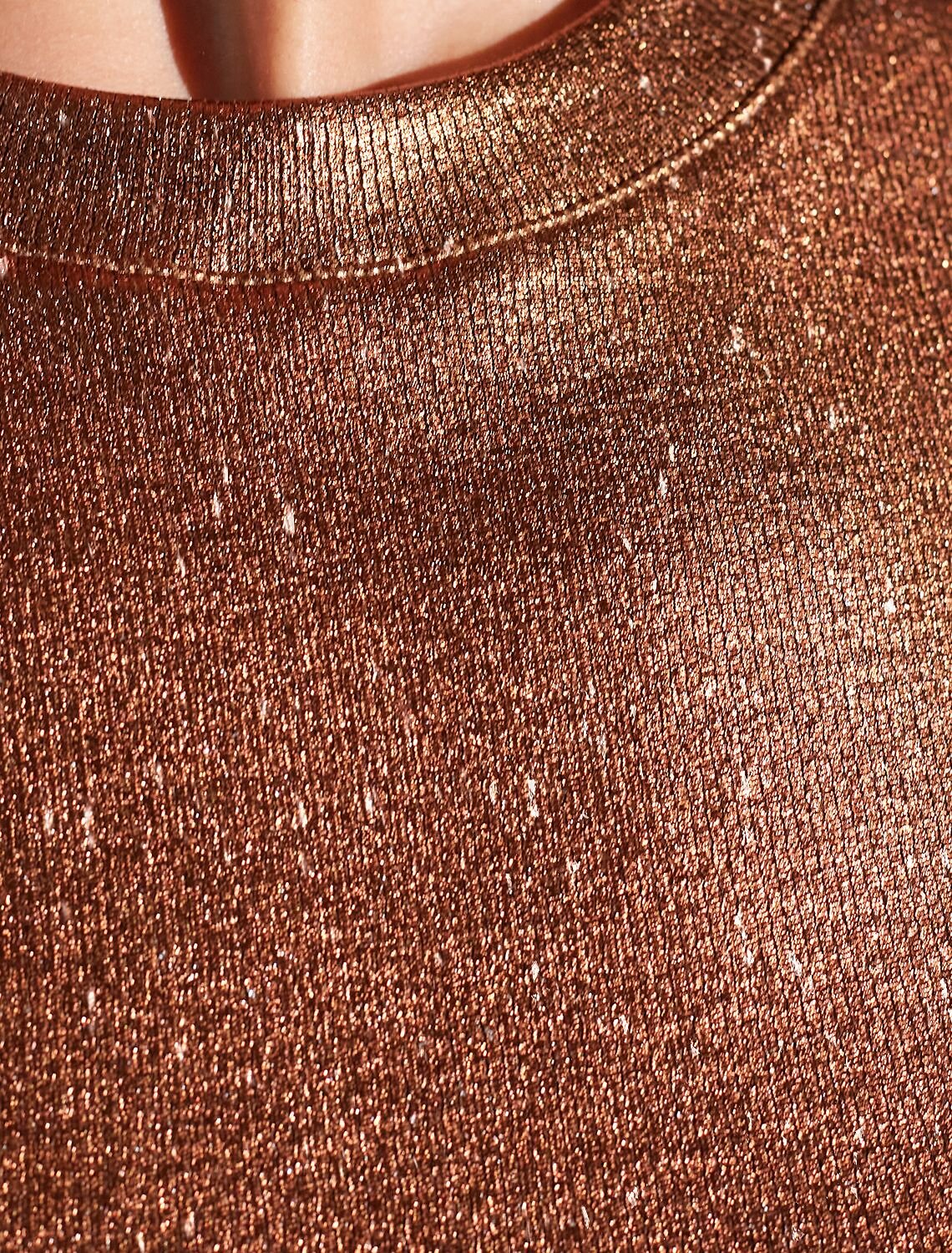 Трендовый матовый металлизированный эффект создает сияющий бронзовый блеск с серебристыми вкраплениями без излишней яркости — это делает топ нарядным и красивым как для праздничного события, так и для повседневной носки в комплекте с деловым костюмом или джинсами. Широкие лямки обеспечивают дополнительный комфорт в течение всего дня. Круглый ворот подчеркивает линию шеи, добавляя образу изысканности.