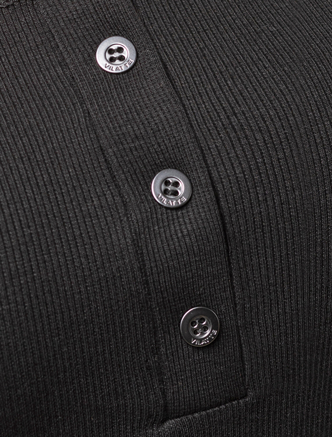 Футболка выполнена из трикотажа в широкий рубчик. Модель с квадратным вырезом дополнена декоративными пуговицами. Эластичный хлопковый трикотаж сидит по фигуре, не сковывает движений и очень комфортный в носке. Фактура вертикальных полос визуально стройнит и вытягивает силуэт. Базовое изделие хорошо впишется в любой гардероб. Идеально подходит для многослойных образов.