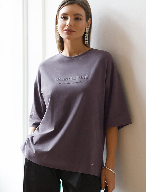 Футболка свободного силуэта выполнена из премиального хлопка. Авторский принт нанесен фактурными красками с устойчивым покрытием. Наличие эластана в составе изделия позволит сохранить безупречный внешний вид в течении долгого времени. Отдельным украшением служит металлический логотип бренда.
