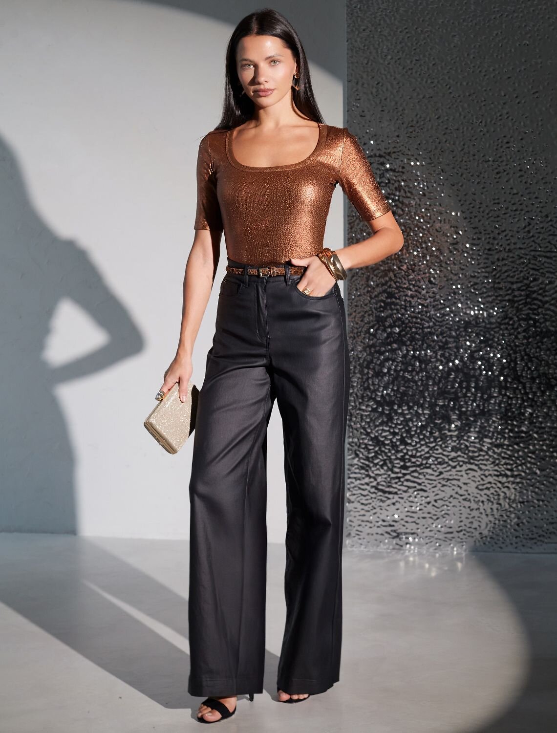 Повседневная футболка универсальна: она сочетается с джинсами, юбками или строгими брюками — легко создать как деловой образ для офиса, так и наряд для вечеринки или ужина вне дома. Матовое покрытие создает благородный блеск без лишней яркости, благодаря чему футболка смотрится свежо и актуально.