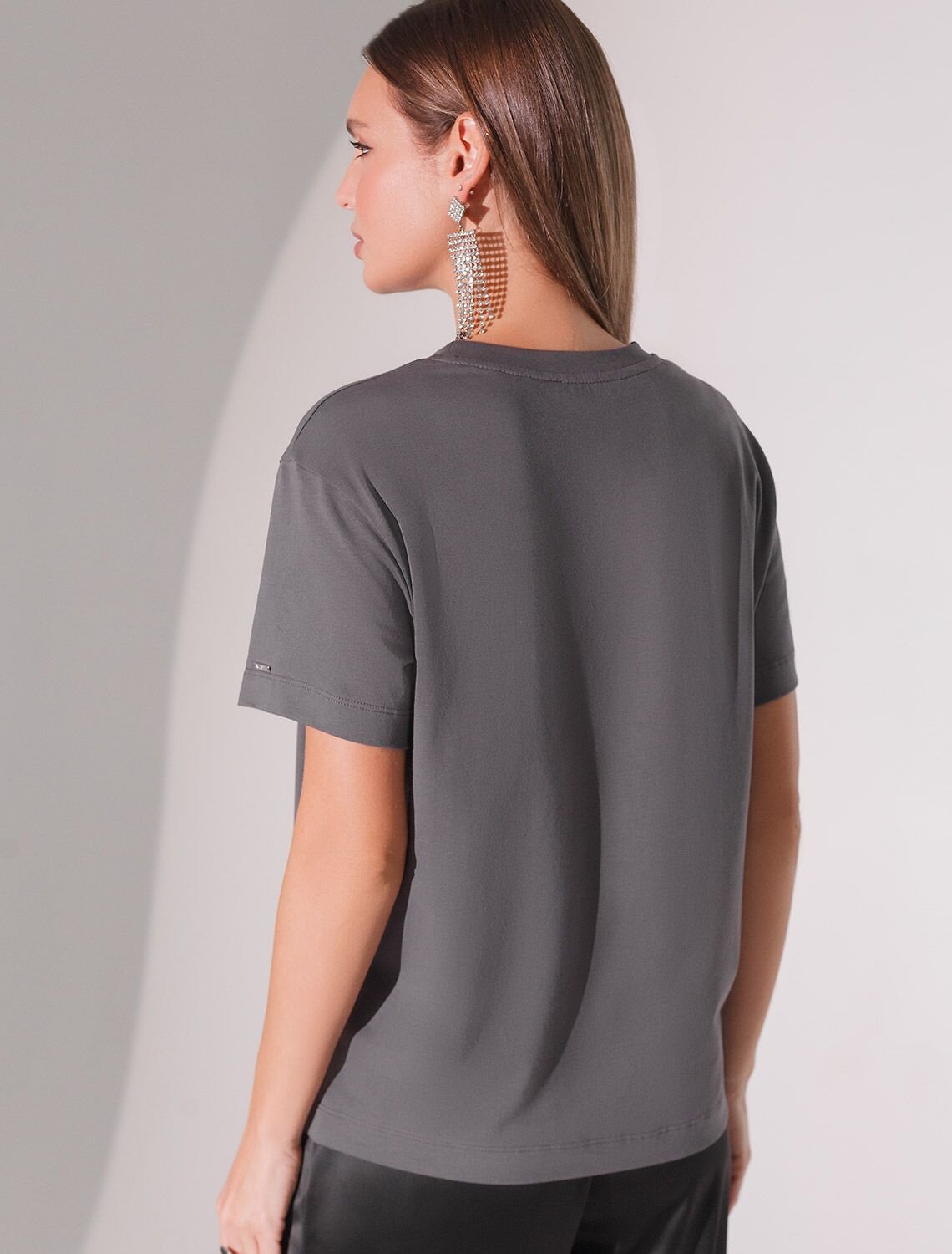 Стильная базовая футболка темно-серого цвета с принтом пайетками в виде рыбки выполнена из плотного хлопка с эластаном для комфортной посадки на любую фигуру. Прямая футболка классического кроя с круглым вырезом, прекрасно подходит для разных типов фигуры, в том числе и на большие размеры. Мягкость хлопка вместе с небольшой долей эластана гарантирует идеальную посадку и свободу движений. Легкая натуральная дышащая ткань премиального качества делает футболку с коротким рукавом идеальным вариантом для повседневной носки дома, на работу или офис. Однотонная футболка дополнена авторским аккуратным принтом зебра, который придает праздничный и элегантный вид без лишней вычурности. Блестящий анималистичный принт аккуратно украшает, добавляя изысканный акцент и создавая легкий мерцающий эффект.