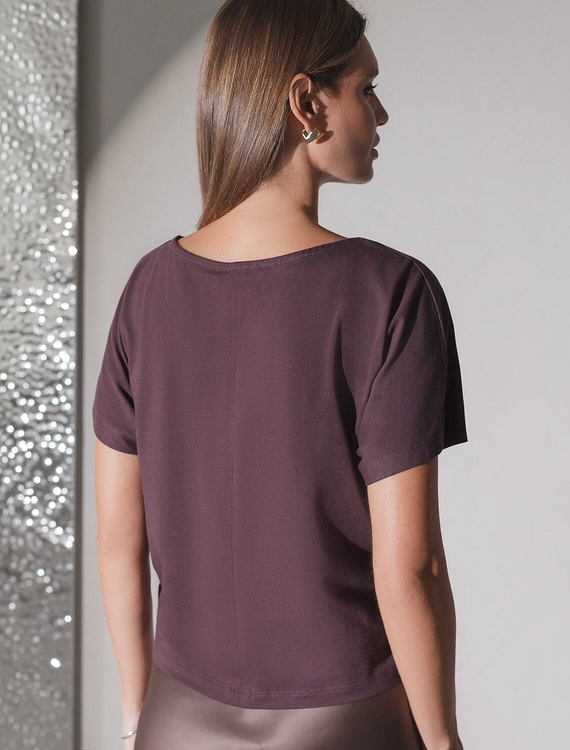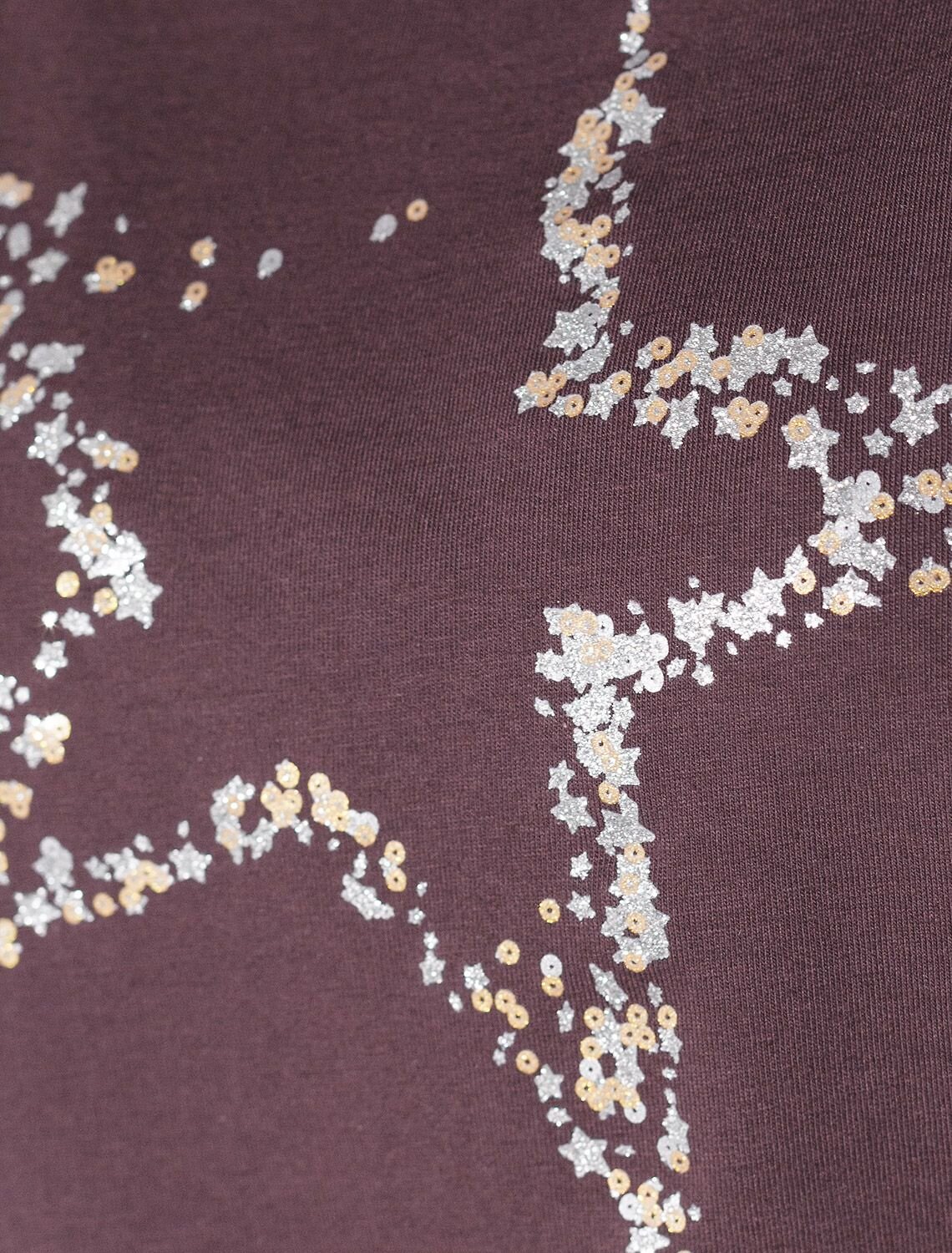 Футболка цвета бургунди идеально подходит для вечеринки и создания яркого образа. Оригинальный принт из фольги в виде звезды придает изделию шикарный вид, который привлечет внимание на любом мероприятии. Модель с вырезом лодочка и цельнокроеным рукавом обеспечивает свободу движений и комфорт в носке. Такой фасон изделия подходит на большие размеры, гармонично сидит на фигуре и помогает создать легкий акцент на достоинствах. Благодаря особенностям кроя с цельнокроеным рукавом удается искусно скроет любые возможные недостатки в области плеч и рук, обеспечивая комфортное прилегание без ощущения скованности. Аккуратный вырез лодочка красиво подчеркивает шею и делает образ элегантным, сохраняя актуальность для разных случаев — от рабочих встреч до вечерних прогулок и праздничных мероприятий.