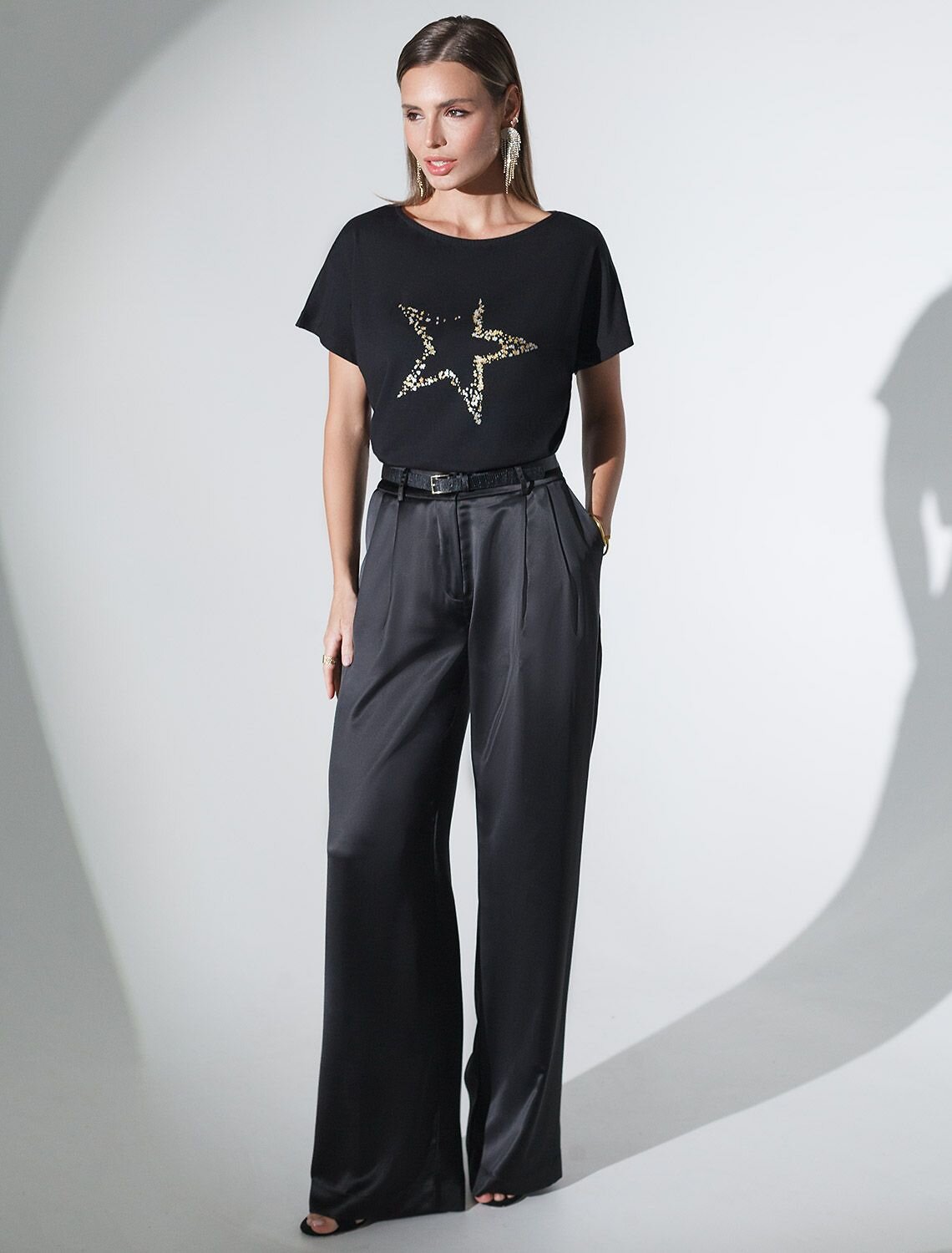 Футболка черного цвета идеально подходит для вечеринки и создания яркого образа. Оригинальный блестящий принт из фольги в виде звезды придает изделию шикарный вид, который привлечет внимание на любом мероприятии. Модель с вырезом лодочка и цельнокроеным рукавом обеспечивает свободу движений и комфорт в носке. Такой фасон изделия подходит на большие размеры, гармонично сидит на фигуре и помогает создать легкий акцент на достоинствах. Благодаря особенностям кроя с цельнокроеным рукавом удается искусно скроет любые возможные недостатки в области плеч и рук, обеспечивая комфортное прилегание без ощущения скованности. Аккуратный вырез лодочка красиво подчеркивает шею и делает образ элегантным, сохраняя актуальность для разных случаев — от рабочих встреч до вечерних прогулок и праздничных мероприятий.