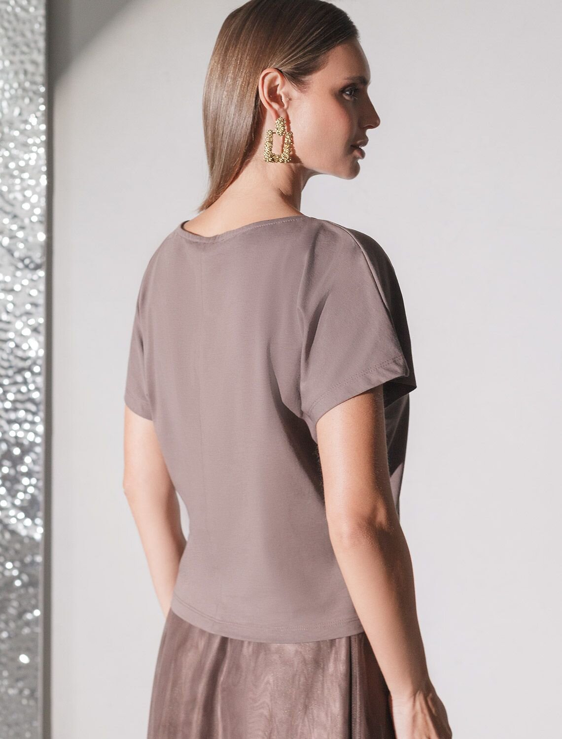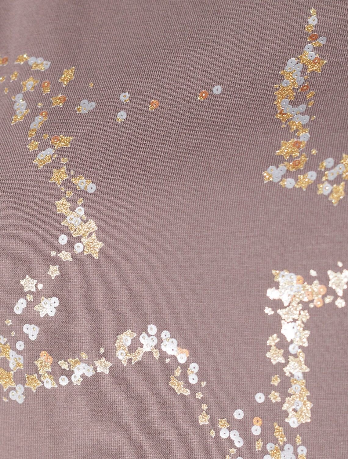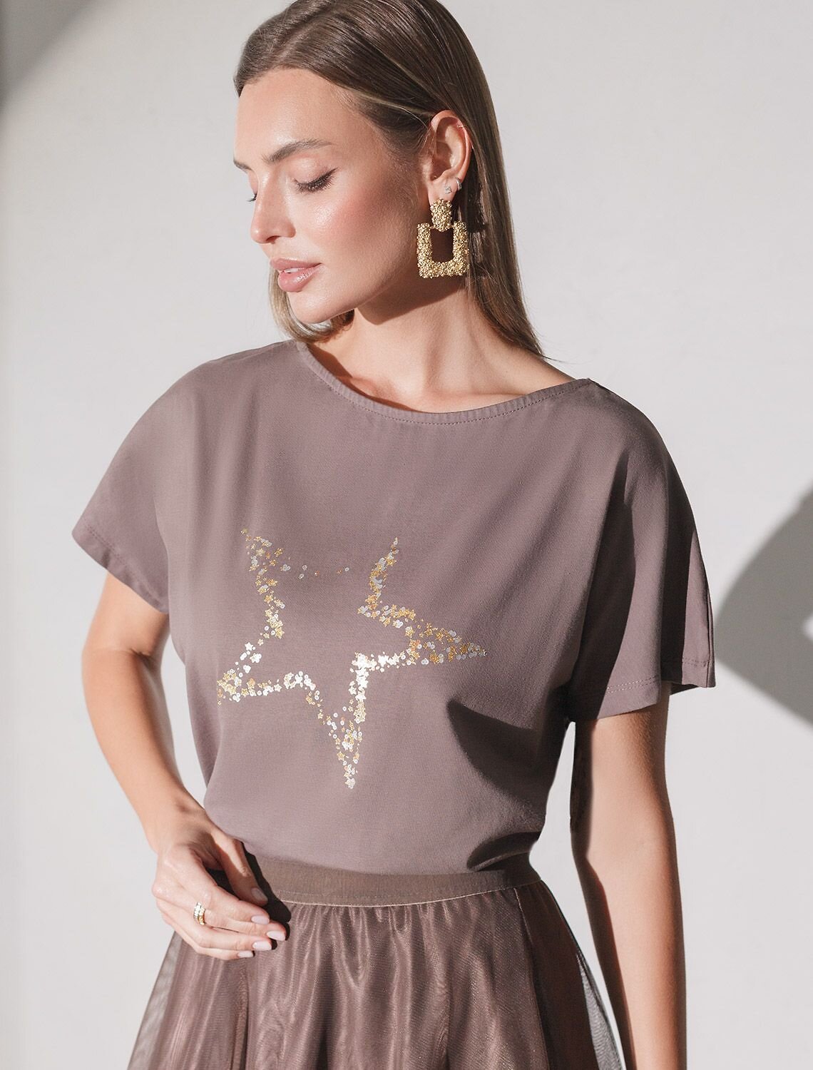 Футболка кофейного цвета идеально подходит для вечеринки и создания яркого образа. Оригинальный принт из блестящей фольги в виде звезды придает изделию шикарный вид, который привлечет внимание на любом мероприятии. Модель с вырезом лодочка и цельнокроеным рукавом обеспечивает свободу движений и комфорт в носке. Такой фасон изделия подходит на большие размеры, гармонично сидит на фигуре и помогает создать легкий акцент на достоинствах. Благодаря особенностям кроя с цельнокроеным рукавом удается искусно скроет любые возможные недостатки в области плеч и рук, обеспечивая комфортное прилегание без ощущения скованности. Аккуратный вырез лодочка красиво подчеркивает шею и делает образ элегантным, сохраняя актуальность для разных случаев — от рабочих встреч до вечерних прогулок и праздничных мероприятий.