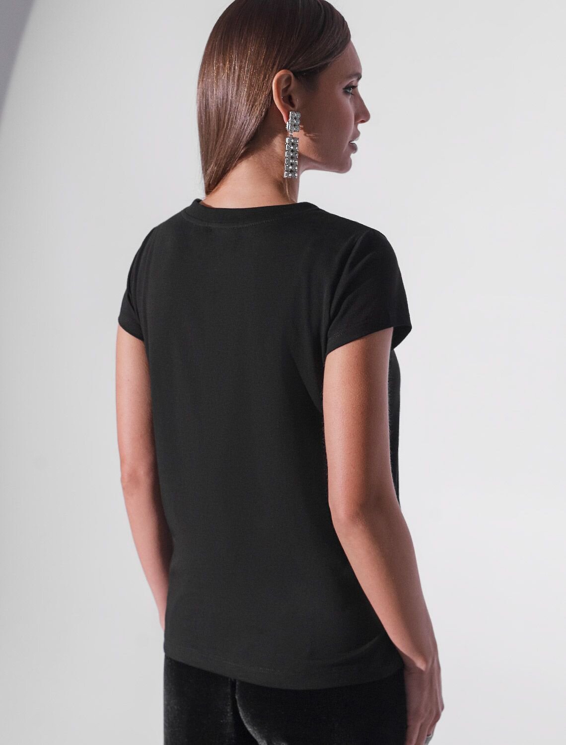Футболка черного цвета идеально подходит для вечеринки и создания яркого образа. Оригинальный принт из серебристых пайеток в виде рыбки придает изделию шикарный вид, который привлечет внимание на любом мероприятии. Модель с круглым вырезом и классическим коротким рукавом обеспечивает свободу движений и комфорт в носке. Такой фасон изделия подходит на большие размеры, гармонично сидит на фигуре и помогает создать легкий акцент на достоинствах. Аккуратный круглый вырез красиво подчеркивает шею и делает образ элегантным, сохраняя актуальность для разных случаев — от рабочих встреч до вечерних прогулок и праздничных мероприятий.