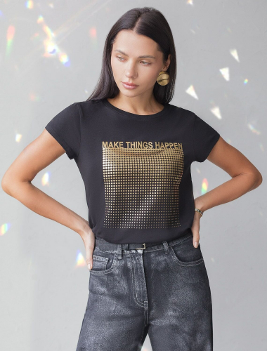 Эта нарядная футболка подходит для создания образа на каждый день и идеально подойдет на выход. Модель не мнется, что делает ее практичным вариантом для активных женщин, которые ценят стиль и удобство.