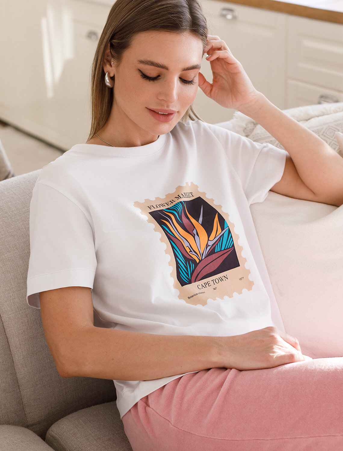 Футболка выполнена из премиального хлопка. Авторский принт нанесен красками с устойчивым покрытием. Перевод: «Flower market, Capetown, botanical collection №7 1977 - Цветочный рынок, Кейптаун, цветочная коллекция №7 1977» Наличие эластана в составе гарантирует абсолютный комфорт и долговечность изделия. Базовая модель впишется в любой гардероб. Дополнительным украшением служит металлическим логотипом бренда.