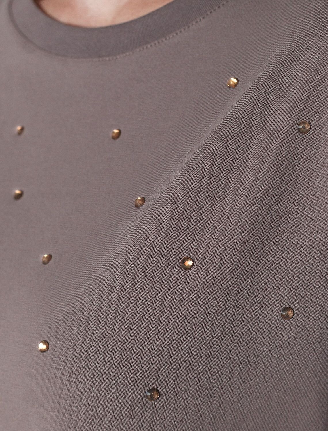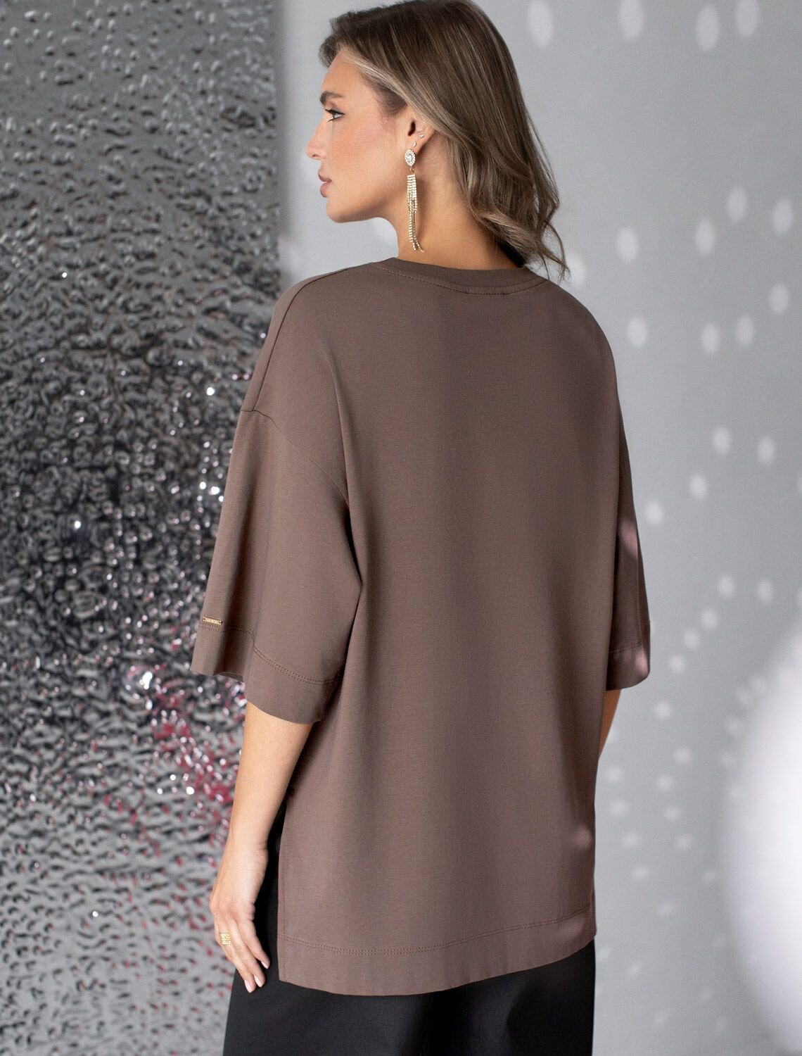 Оверсайз футболка кофейного цвета из премиального хлопка с добавлением эластана создана для комфорта и стиля каждый день. Натуральный материал приятный к телу, дышащая ткань хорошо держит форму и подходит для повседневной носки дома, в офисе или на прогулке. Классический свободный крой, удлиненный прямой силуэт и свободная посадка делают эту базовую футболку универсальным решением для любой фигуры и роста, включая плюс сайз размеры и беременных девушек, отлично скроет животик. Широкие рукава держвт форму и подойдут на полные руки. Нарядная футболка украшена авторским принтом в виде россыпи страз в тон основного полотна, которые создают красивый мерцающий эффект. Такой акцент делает модель уместной как для особых случаев, так и для ежедневных образов.