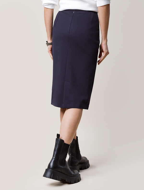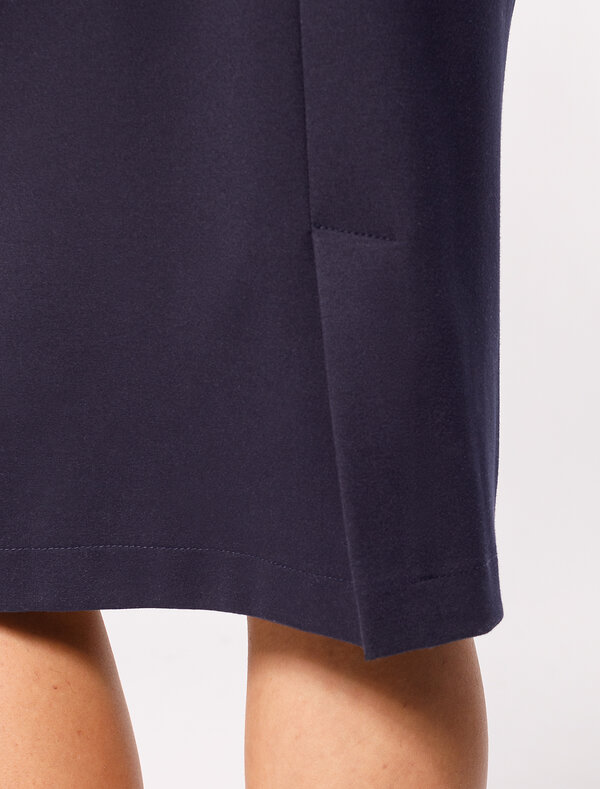 Юбка-карандаш выполнена из плотного джерси. Высокая посадка на талии. Сзади застежка на потайную молнию и шлица. Эластичный джерси почти не мнется, хорошо сохраняет форму и не оставляет заломов. Классический вариант для офиса или делового мероприятия.