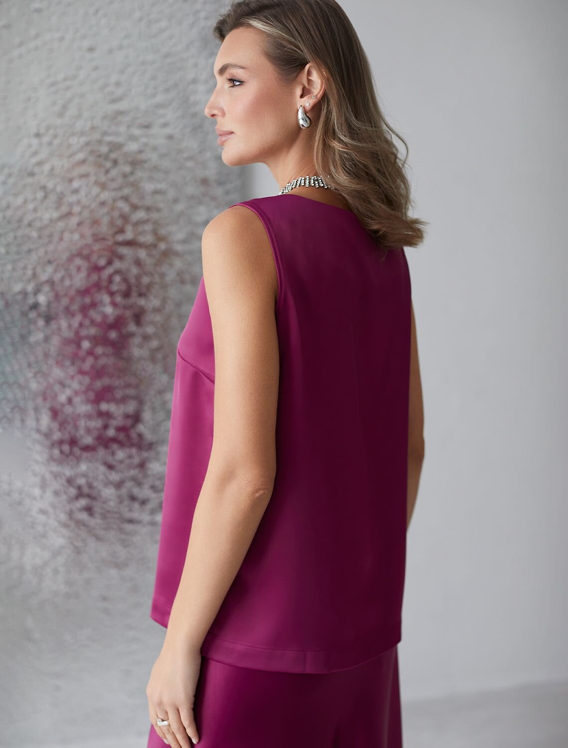 Изящный нарядный топ цвета бургунди с V вырезом выполнен из нежного премиального сатина с небольшим добавлением эластана. Свободный крой обеспечивает комфорт, легкость и свободу движений, подчеркивая изысканность образа и женственность силуэта. Особое внимание привлекает мягкий приглушенный блеск материала, придающий топу дорогое и утонченное звучание. Материал отличается приятной текстурой и долговечностью, что гарантирует долгий срок службы топа. Благодаря струящейся, но плотной ткани, топ мягко ложится по фигуре, придавая легкость и подчеркивая достоинства любого типа фигуры. Приятная на ощупь текстура и хорошая воздухопроницаемость - делает повседневный топ отличным выбором для теплого времени года или для носки в помещении. Топ подойдет как на большие размеры, так и на маленькие — универсальность фасона позволяет чувствовать себя уверенно вне зависимости от комплекции. Декольте оформлено аккуратно, создавая эффектный акцент без излишней открытости.