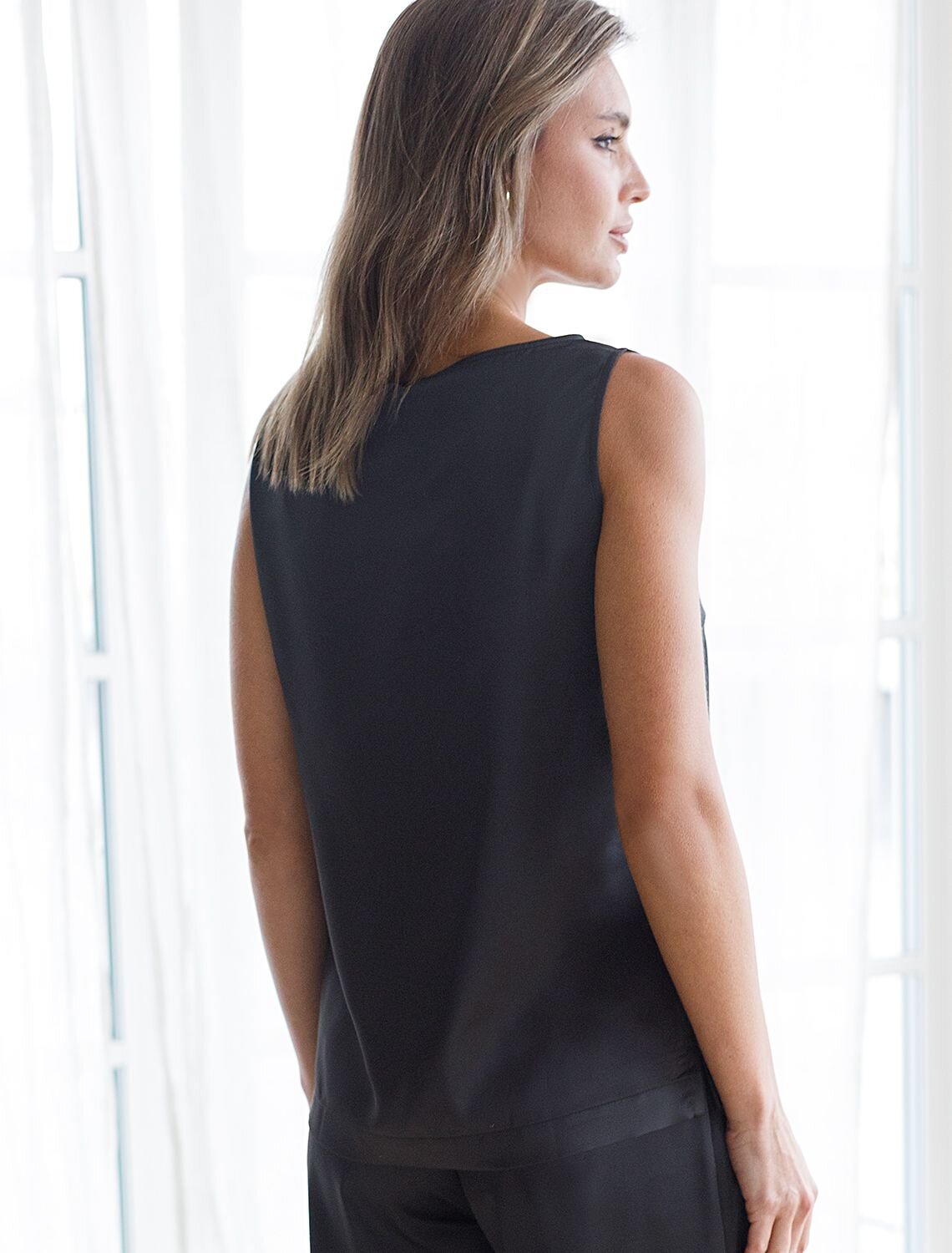 Изящный нарядный топ черного цвета выполнен из нежного премиального сатина с небольшим добавлением эластана. Свободный крой обеспечивает комфорт, легкость и свободу движений, подчеркивая изысканность образа и женственность силуэта. Особое внимание привлекает мягкий приглушенный блеск материала, придающий топу дорогое и утонченное звучание. Натуральный материал отличается приятной текстурой и долговечностью, что гарантирует долгий срок службы топа. Благодаря струящейся, но плотной ткани, топ мягко ложится по фигуре, придавая легкость и подчеркивая достоинства любого типа фигуры. Приятная на ощупь текстура и хорошая воздухопроницаемость - делает повседневный топ отличным выбором для теплого времени года или для носки в помещении. Топ подойдет как на большие размеры, так и на маленькие — универсальность фасона позволяет чувствовать себя уверенно вне зависимости от комплекции. Декольте оформлено аккуратно, создавая эффектный акцент без излишней открытости.