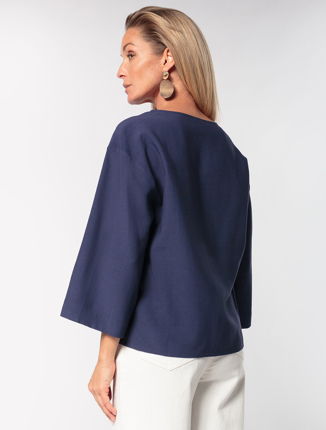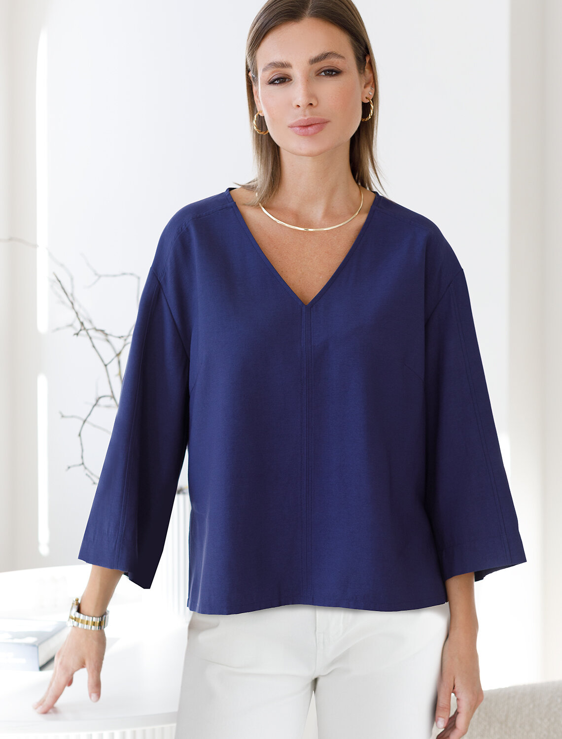 Свободная блузка со спущенным плечом выполнена из плотного лиоцелла. Добавление синтетических волокон в составе изделия предотвращает сминаемость. Модель с V-вырезом дополнена боковыми разрезами и декоративным швом спереди. Подходит для любой фигуры. Для создания расслабленного образа, сочетайте в костюме с брюками D24.214, D24.218, шортами D28.054 и юбкой D26.181