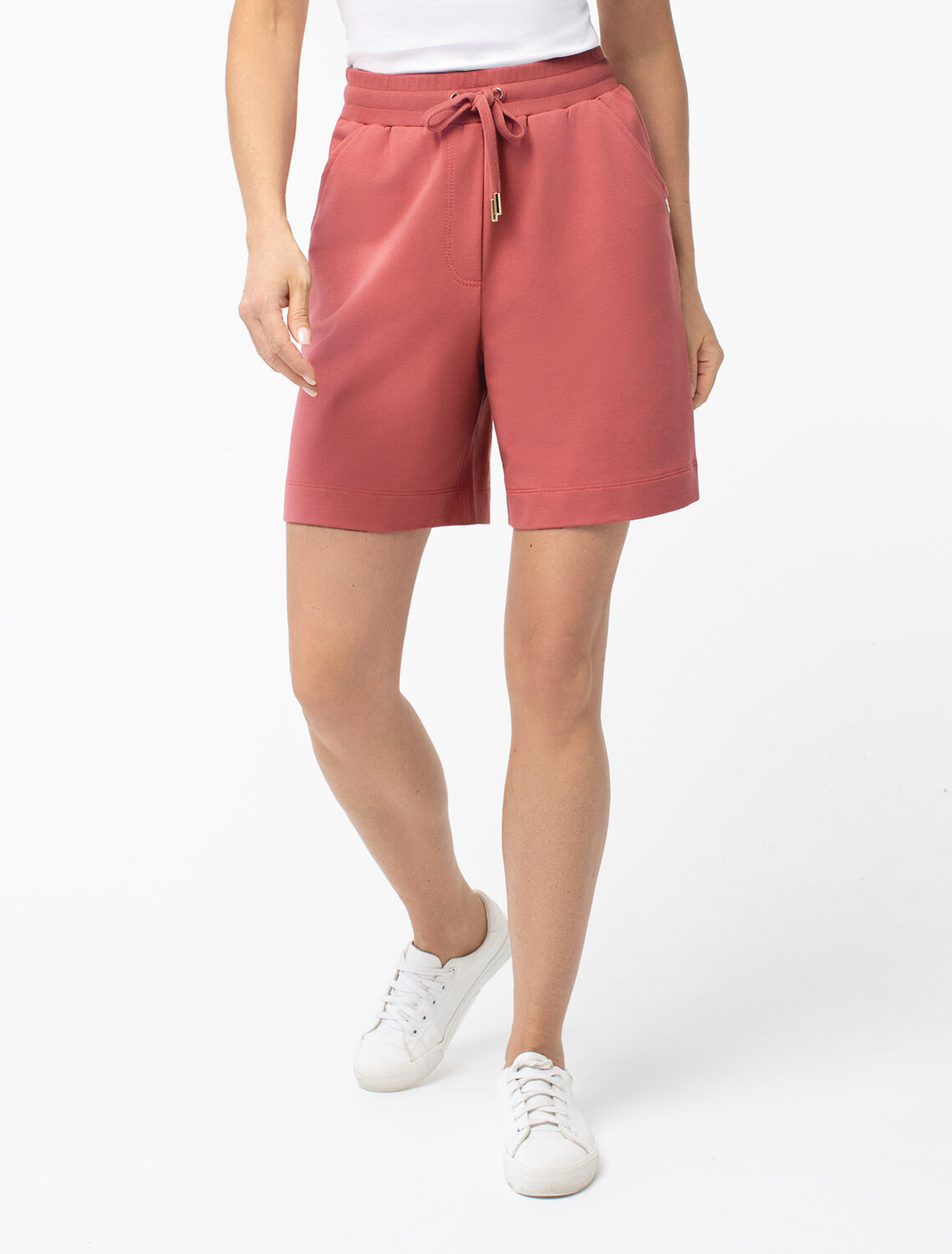 Шорты выполнены из футера двухнитки с эластаном. Модель прямого кроя дополнена боковыми карманами и одним задним карманом. Пояс выполнен из эластичного трикотажа в рубчик. В пояс вставлен плоский хлопковый шнур в тон изделия с золотистыми наконечниками. Изделие дополнено металлическим логотипом бренда. Сочетается в костюме с жакетом D49.078, джемпером D49.079, D49.080 и футболкой D49.081