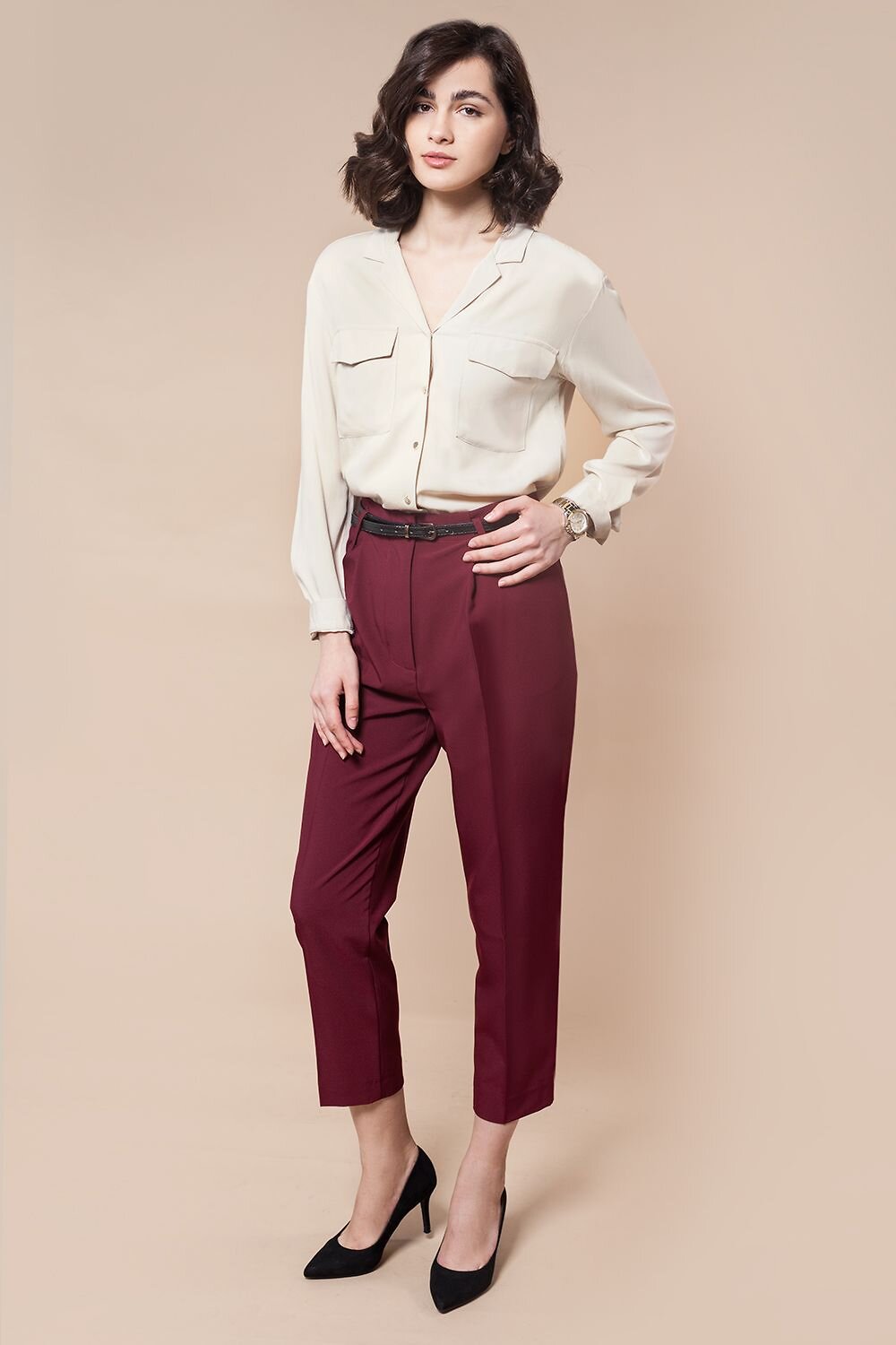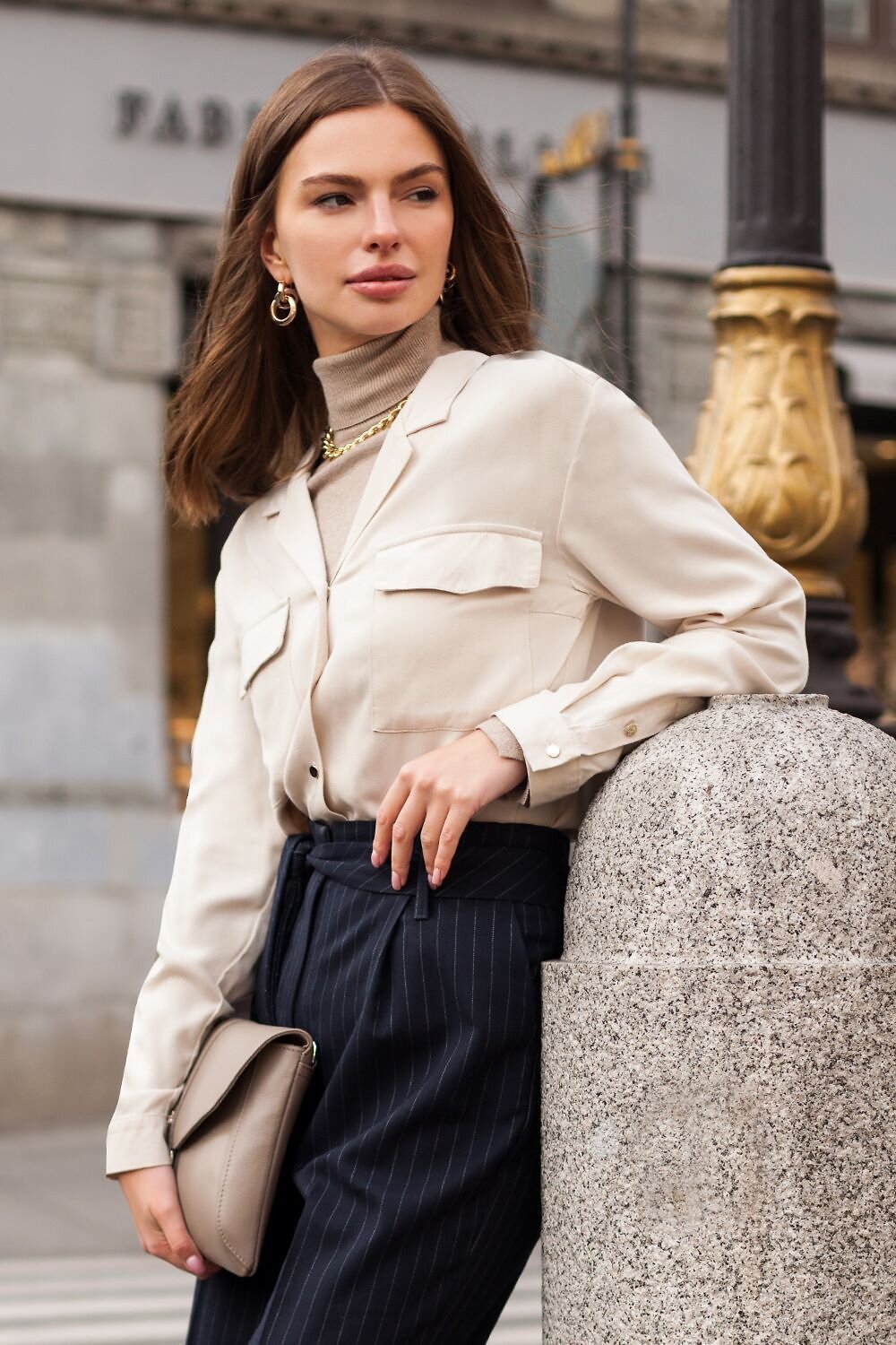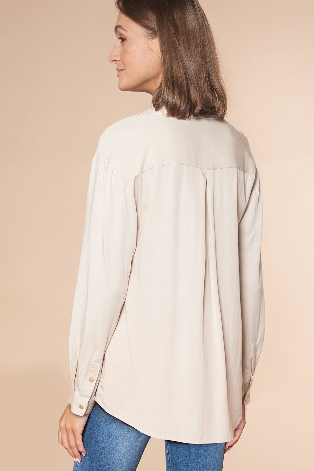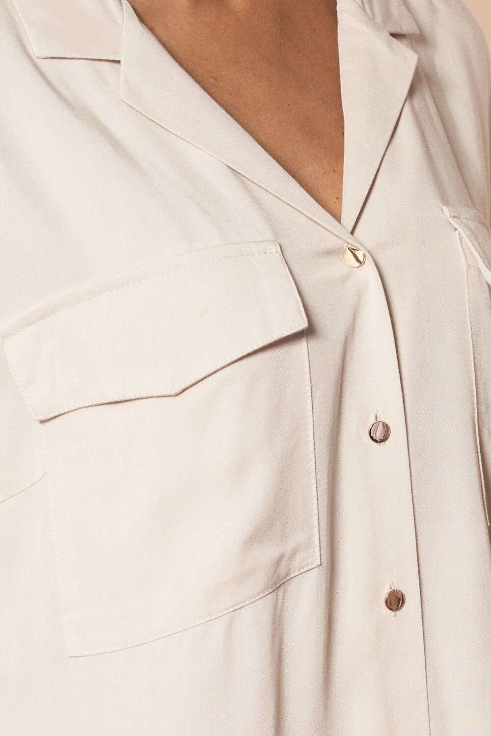 Блузка из премиальной вискозы в рубчик в стиле "сафари". Важный акцент эфффектные контрастные отделочные строчки, подчеркивающие этот стиль. Золотистые пуговицы являются ярким акцентом на классическом для стиля "сафари" бежевом цвете изделия