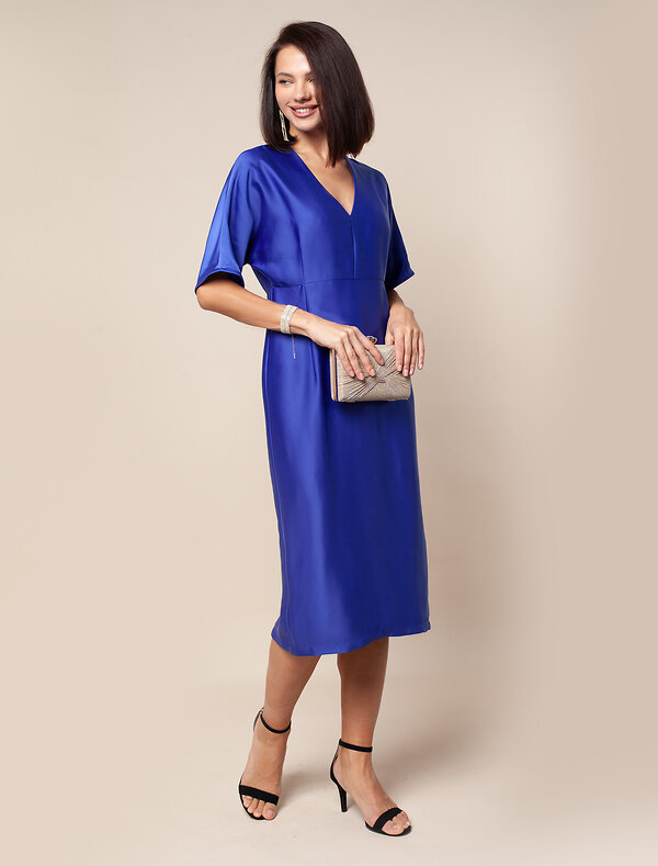 Платье с глубоким V-вырезом и рукавом «летучая мышь» выполнено из тончайших нитей плотного сатина, плетение которых создает полуматовый блеск, напоминающий натуральный шёлк. Модель с длинными глубокими вытачками спереди и сзади выглядит скульптурно, но за счет струящейся ткани сохраняется плавность силуэта. Ткань почти не мнется и имеет легкий вес. Комфортная длина ниже колена и застежка на молнию.