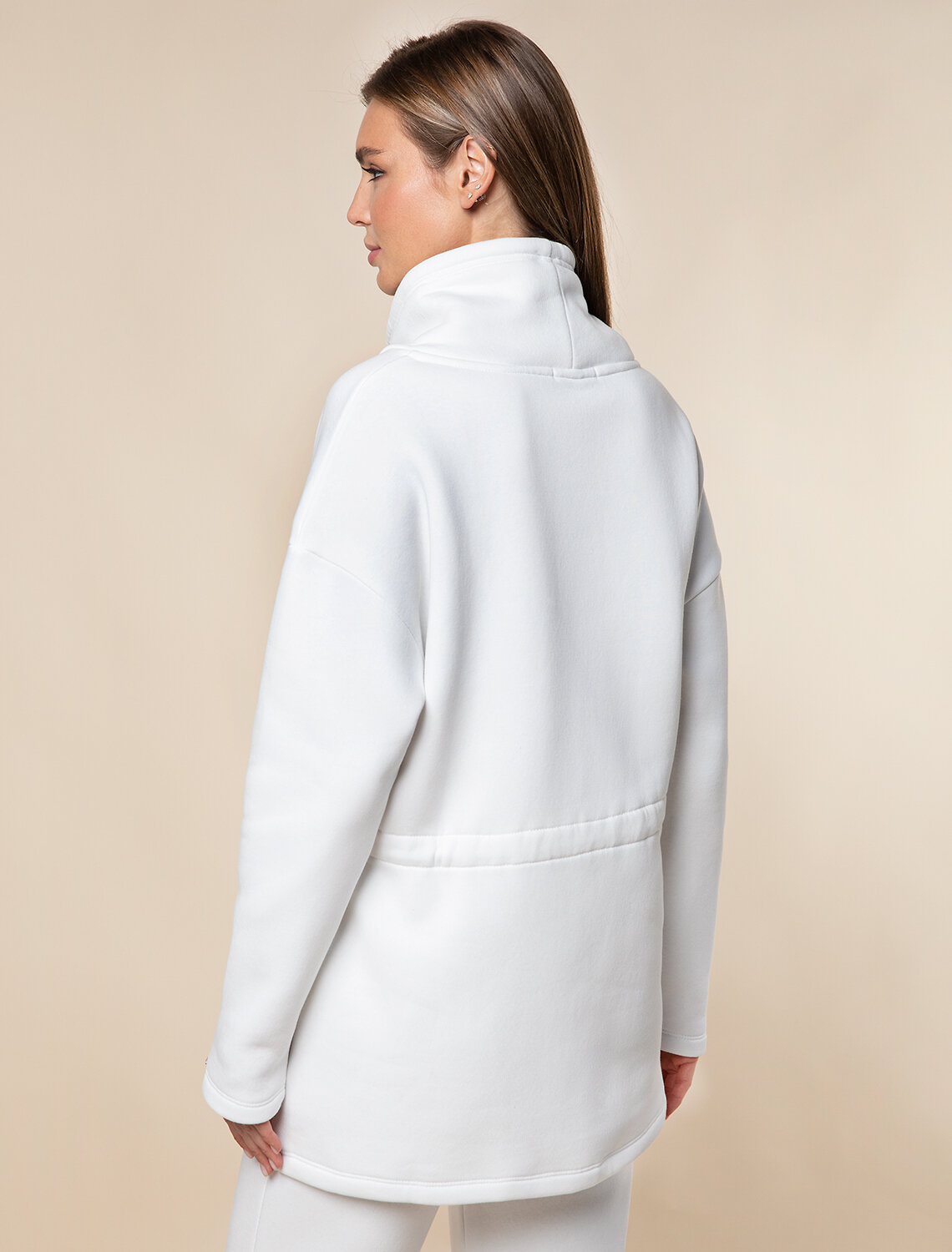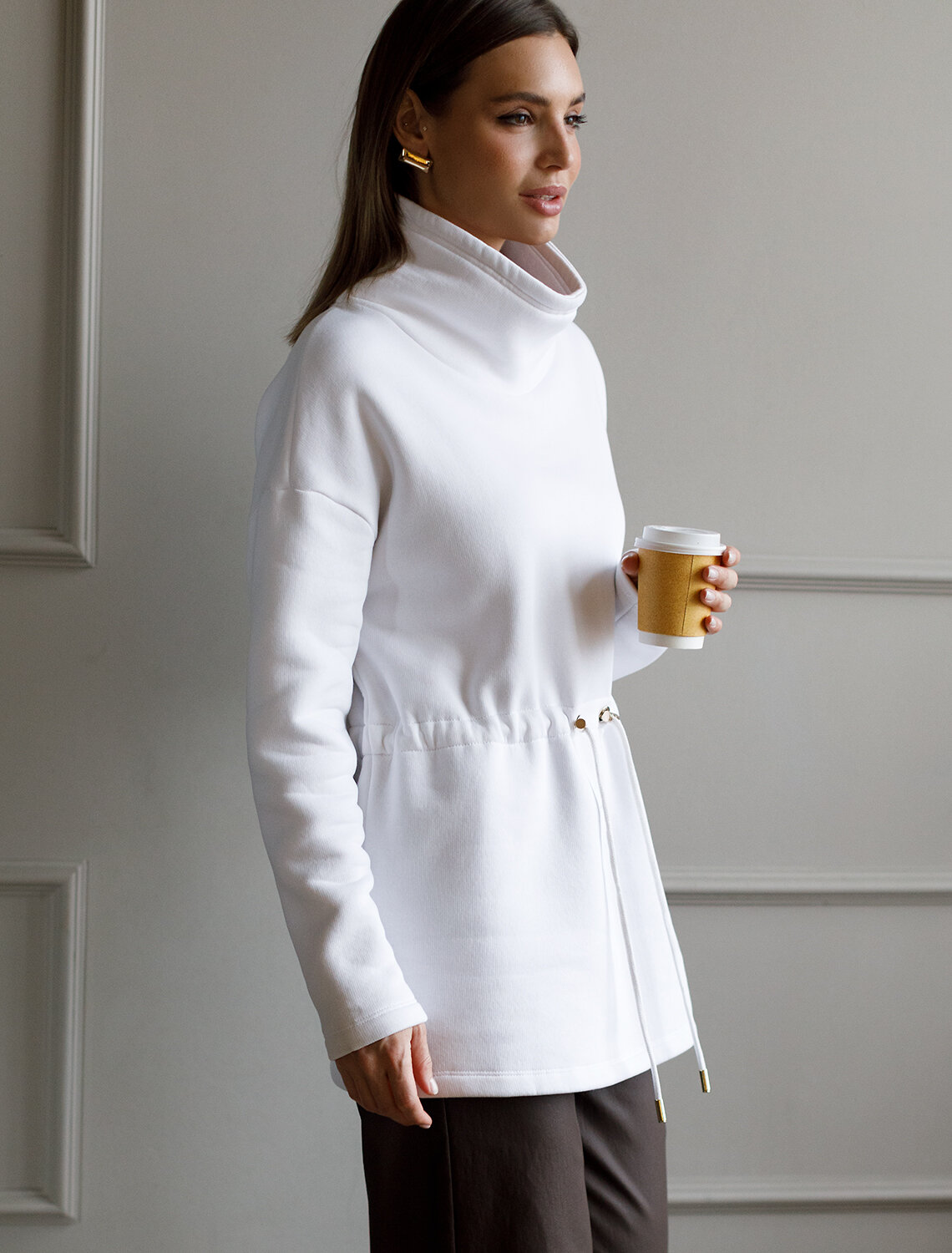 Джемпер выполнен из премиального футера-трехнитки. Модель с начесом дополнена хлопковым шнуром на талии регулируемым стопперами. Регулируя шнурок можно получить сразу две модели, свободный джемпер прямого кроя и дизайнерское решение с акцентом на талии. Соберите костюм вместе с брюками D44.129